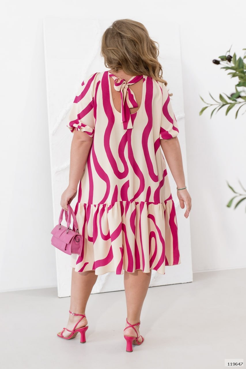 Ця сукня — про легкість, затишок і трішки романтики. Вільний фасон ідеально сідає на будь-яку фігуру, даруючи максимальний комфорт. Напівкругла горловина м’яко зібрана на гумці — виглядає ніжно та делікатно. Короткі рукави у стилі реглан із легкими збірками на резинках додають силуету об’єм і невимушеність. Родзинка моделі — круглий виріз на спинці, зав’язаний стрічкою в тон, що додає образу жіночності та легкої інтриги. Вздовж усієї спинки йде акуратний шов, який гарно оформлює силует і підкреслює вертикальну лінію. А поділ, оздоблений воланом, створює відчуття руху, легкості та літнього настрою