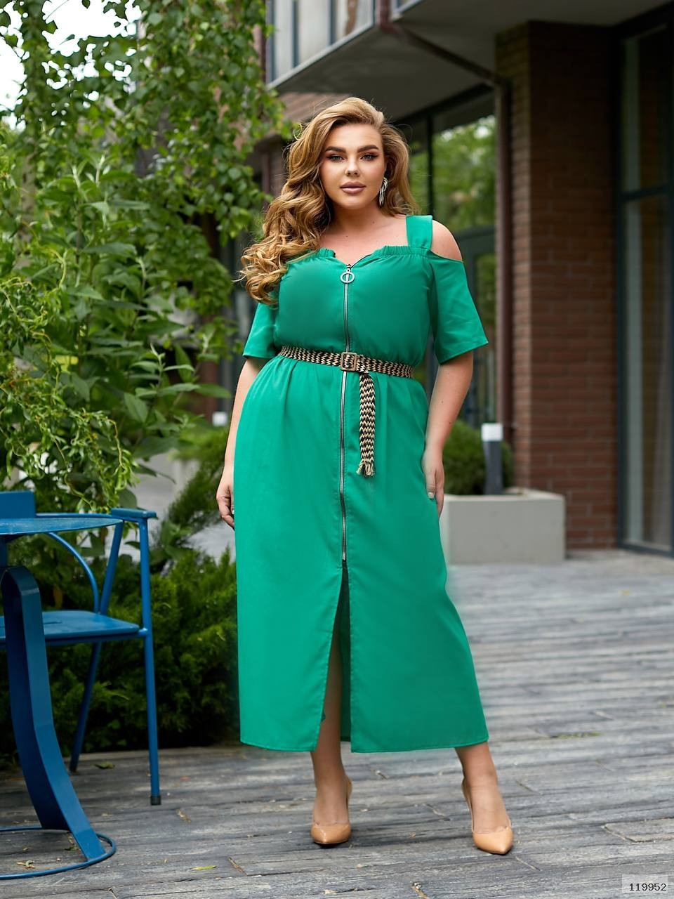 Сукня довжиною міді з оригінальним кроєм. Верх має відкриті плечі та короткі рукави, створюючи стильний та жіночний образ. По центру проходить блискавка із декоративним кільцем на замку, додаючи сучасний акцент. Талія підкреслена плетеним ременем з металевою пряжкою, що створює витончений силует. Внизу блискавка трохи розстебнута, формуючи розріз для зручності руху