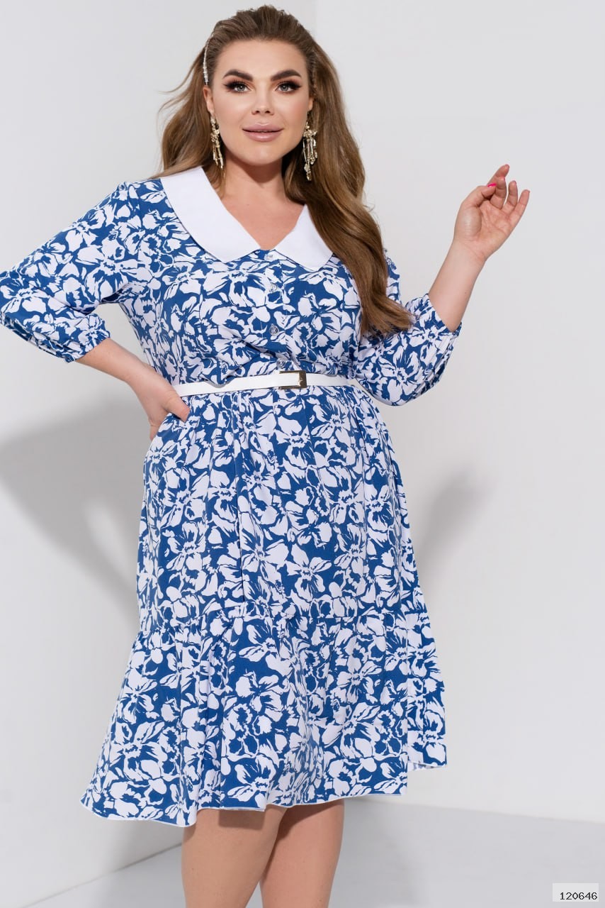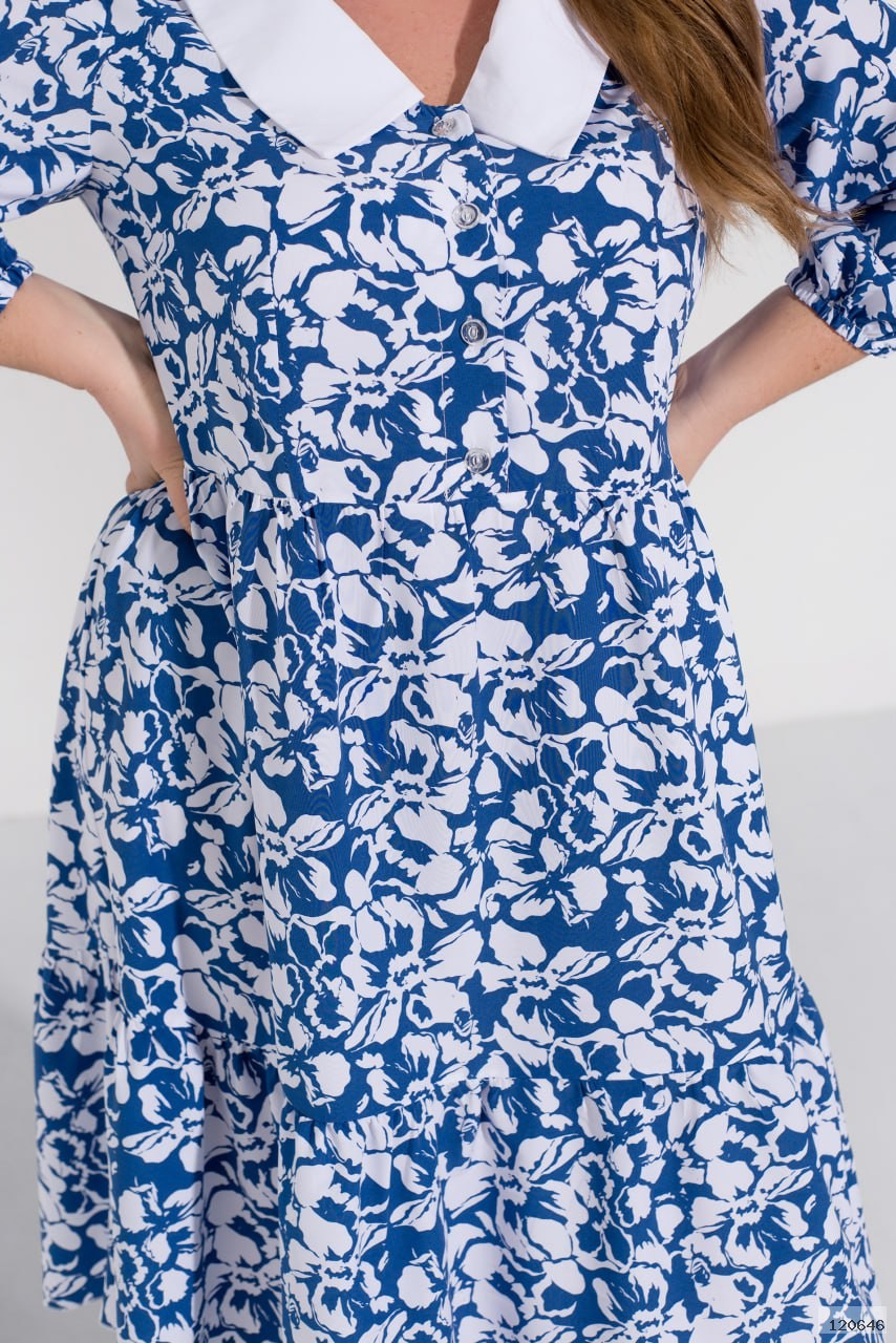 Ця чарівна сукня міді привертає увагу своїм грайливим квітковим принтом та стильним контрастним воротником, який є трендом 2024. Застібається на ряд гудзиків, які розташовані на планці до відрізної лінії талії, надаючи образу елегантність та оригінальність. Рукава завершуються на 3/4, а низ сукні прикрашений воланом, що додає легкості та грайливості. Ця сукня — ідеальний вибір для створення трендового та жіночного образу.