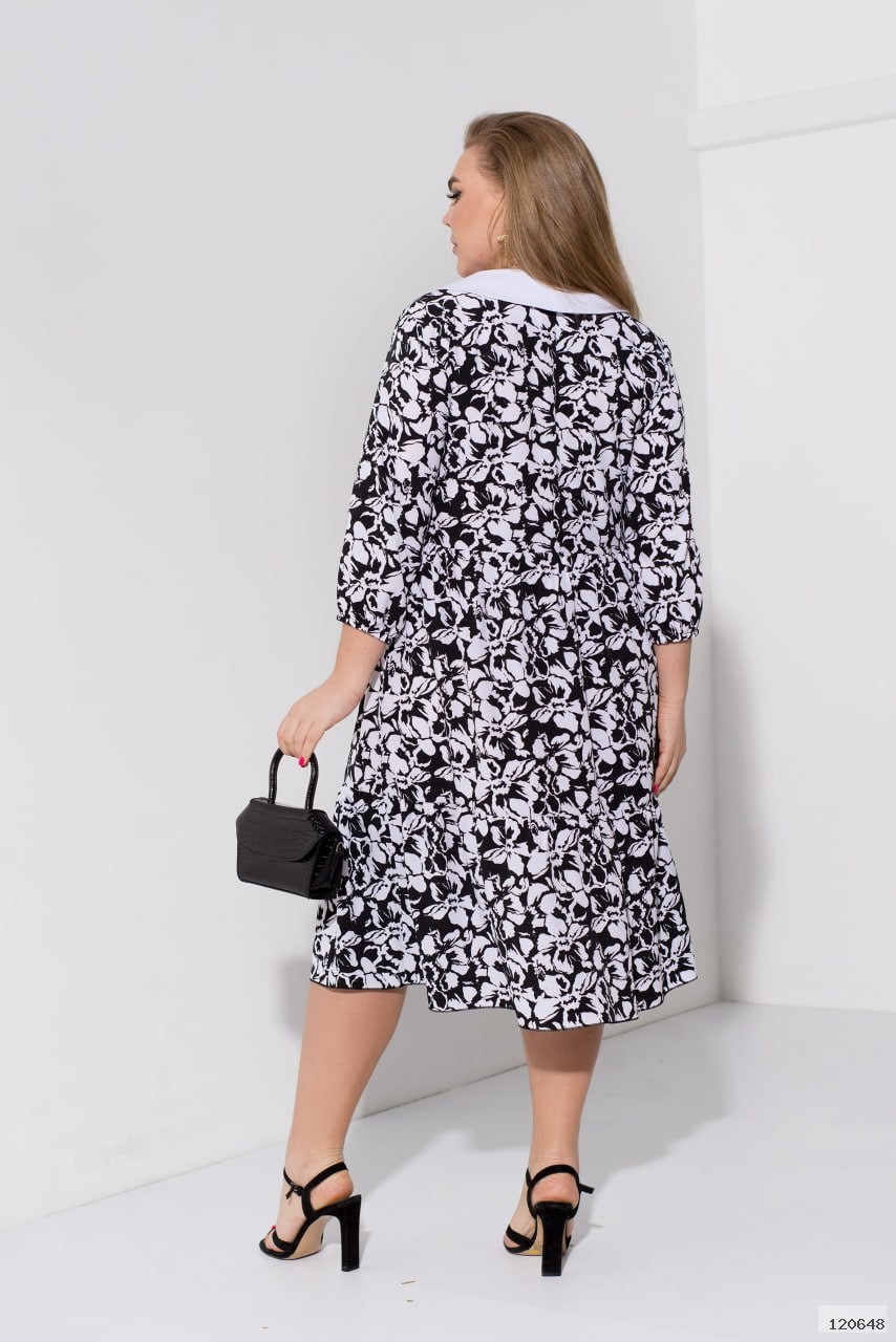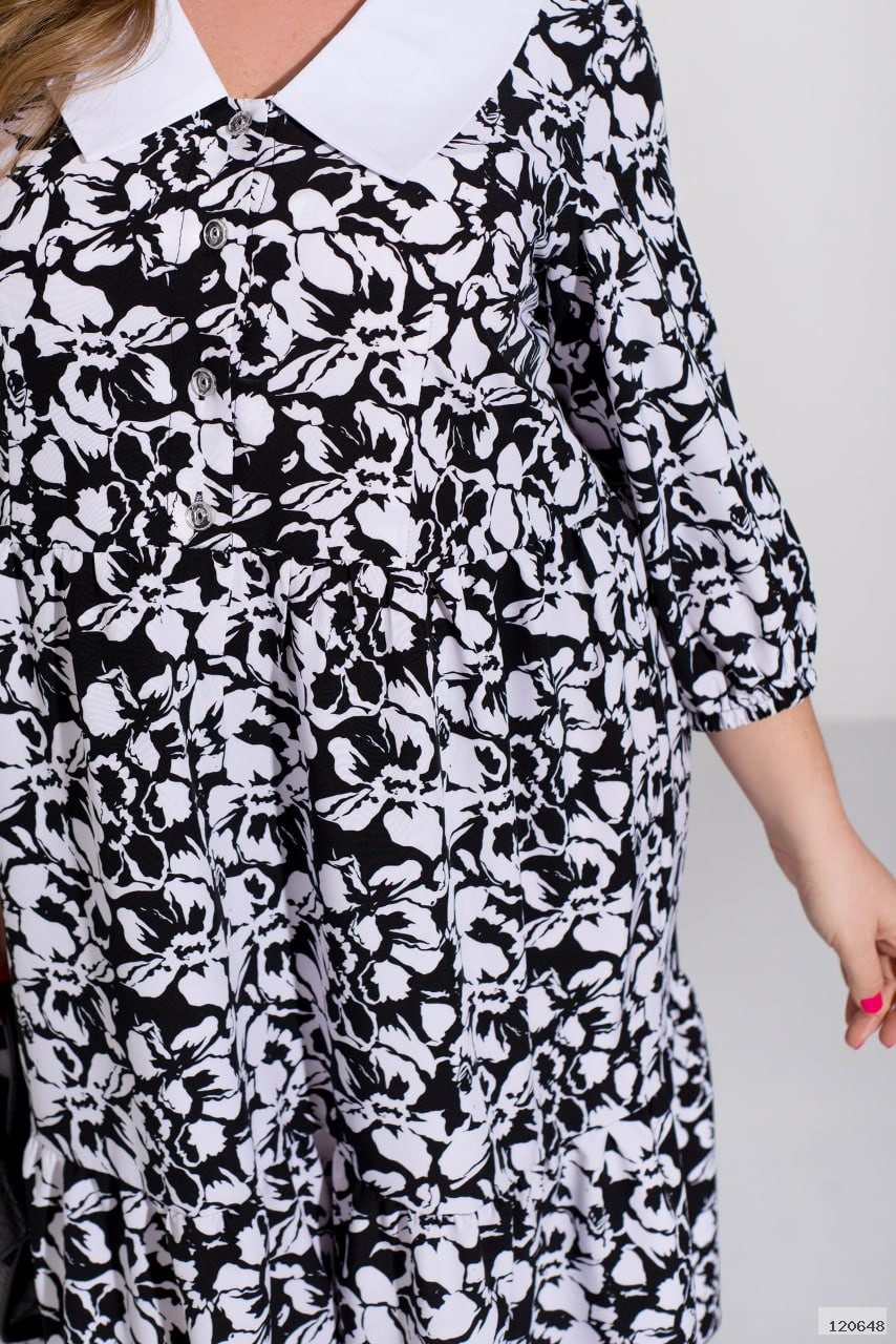 Ця чарівна сукня міді привертає увагу своїм грайливим квітковим принтом та стильним контрастним воротником, який є трендом 2024. Застібається на ряд гудзиків, які розташовані на планці до відрізної лінії талії, надаючи образу елегантність та оригінальність. Рукава завершуються на 3/4, а низ сукні прикрашений воланом, що додає легкості та грайливості. Ця сукня — ідеальний вибір для створення трендового та жіночного образу.