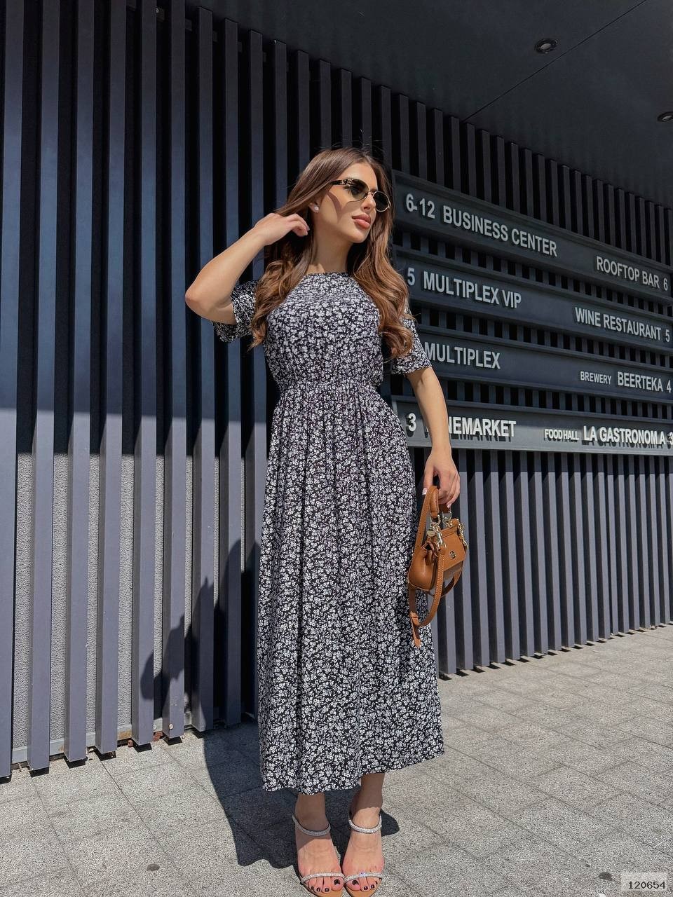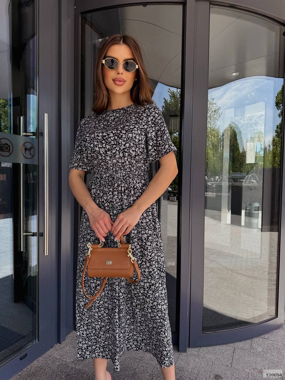 Це легке міді-плаття з короткими рукавами та дрібним квітковим візерунком. Модель має приталений крій у верхній частині й вільну спідницю, що створює жіночний і комфортний силует. Ідеальний варіант для теплої пори року.