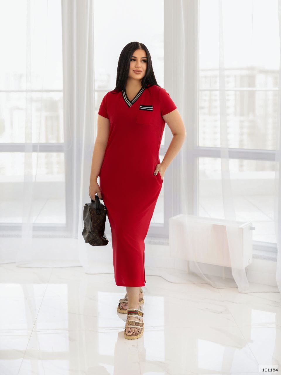 Сукня спортивного стилю із V-образним вирізом декольте і розрізами внизу по боках. Є дві кишені