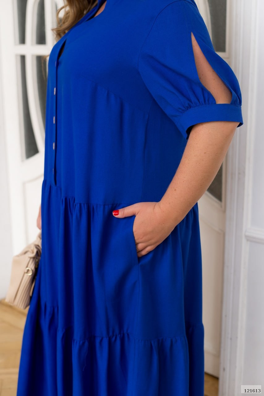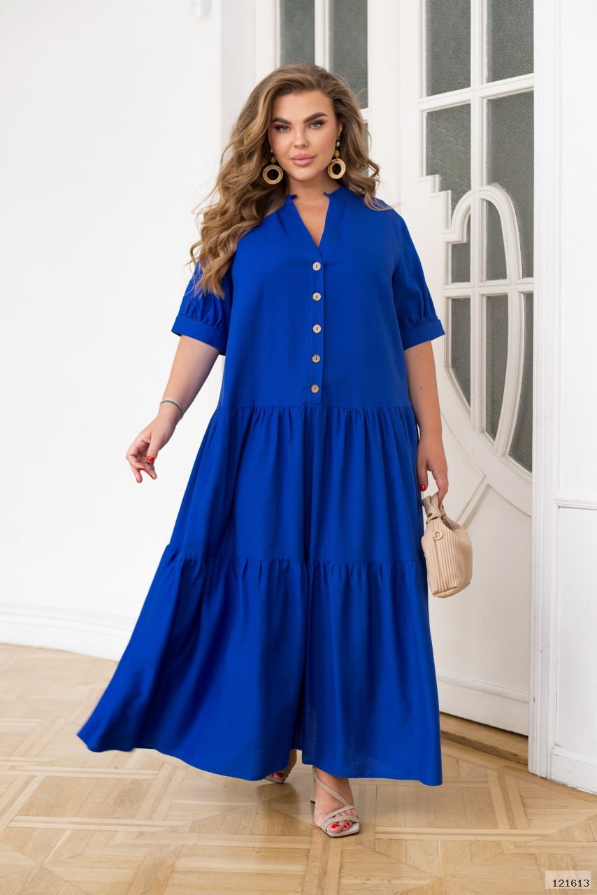Легка, дихаюча та така стильна — ця лляна сукня стане твоїм улюбленим варіантом на спекотні дні. V-подібний виріз із акуратним комірцем додає образу стриманої жіночності, а ряд ґудзиків спереду — класики з ноткою романтики. Рукави — окрема любов: з розрізами та манжетами, вони виглядають дуже цікаво й дарують свободу рухів. Відрізна спідниця з кількох м’яких воланів створює легкий, живий силует, який красиво колихається на вітрі. Ця сукня — ідеальна для прогулянок, подорожей або просто щоб відчути себе особливою навіть у звичайний день.
