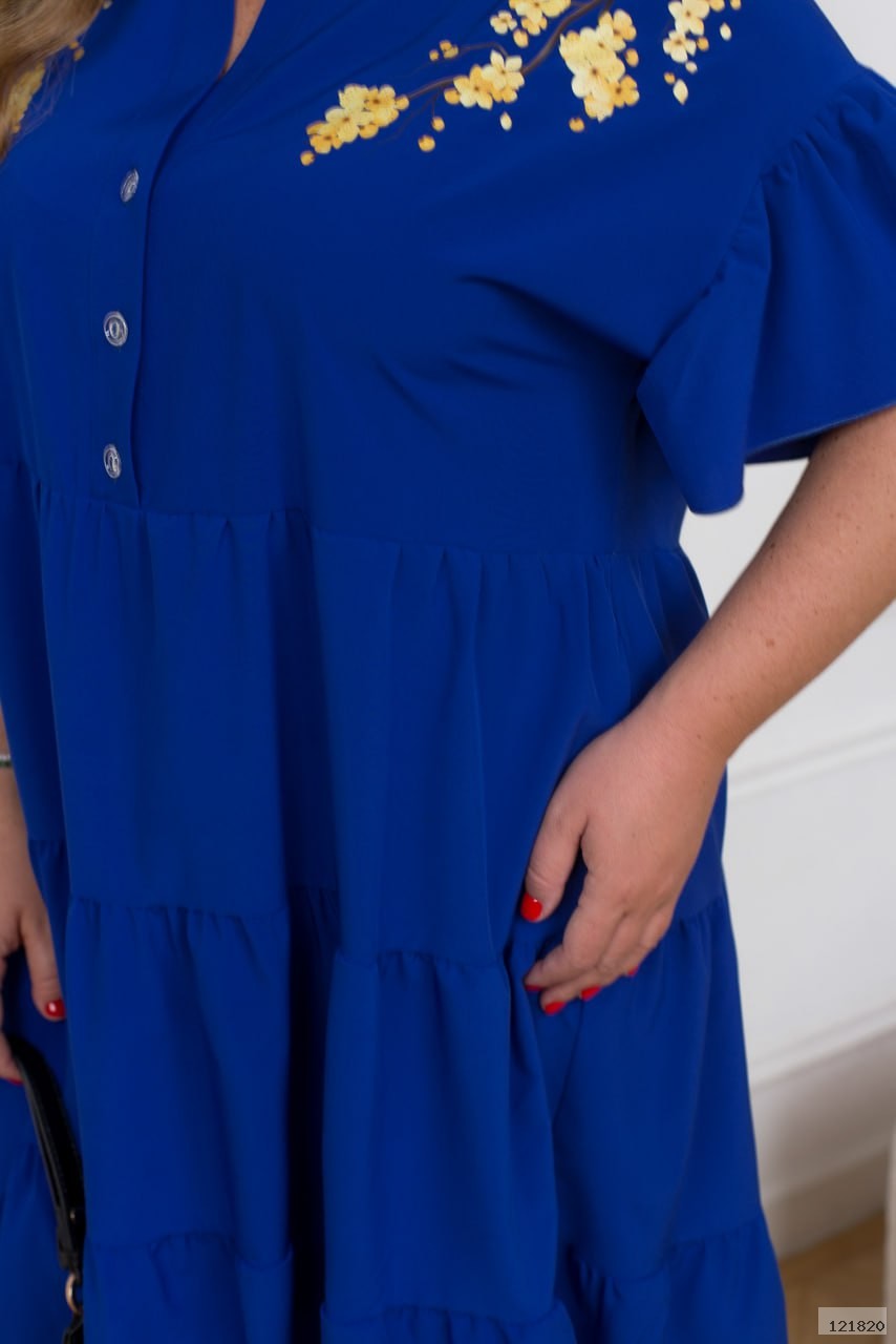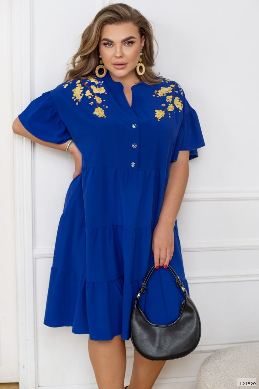 Ця сукня з ніжного софту — просто мрія для теплих сонячних днів. V-подібний виріз у поєднанні з акуратним комірцем красиво підкреслює зону декольте й додає образу витонченості. Спереду — ряд декоративних ґудзиків, які не лише стильні, а й додають сукні особливого шарму. Рукава-крильця створюють легкий, романтичний настрій, а спідниця з трьома воланами грайливо розвівається з кожним кроком. Ідеальна форма для тих, хто любить поєднувати комфорт і жіночність.