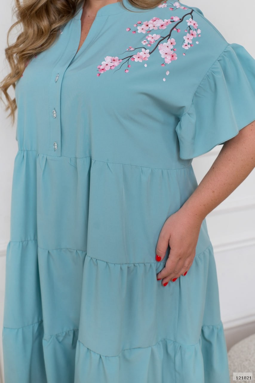 Ця сукня з ніжного софту — просто мрія для теплих сонячних днів. V-подібний виріз у поєднанні з акуратним комірцем красиво підкреслює зону декольте й додає образу витонченості. Спереду — ряд декоративних ґудзиків, які не лише стильні, а й додають сукні особливого шарму. Рукава-крильця створюють легкий, романтичний настрій, а спідниця з трьома воланами грайливо розвівається з кожним кроком. Ідеальна форма для тих, хто любить поєднувати комфорт і жіночність.