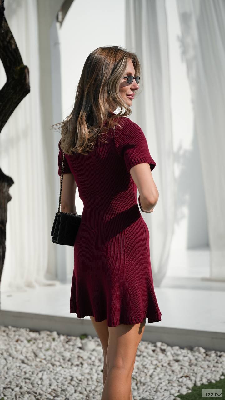 Коротка в'язана сукня з акцентною планкою на ґудзиках — це сучасне переосмислення класики. Приталений силует підкреслює фігуру, вертикальна в'язка візуально витягує лінії, а акуратні кишеньки створюють легкий натяк на ретро-шик.