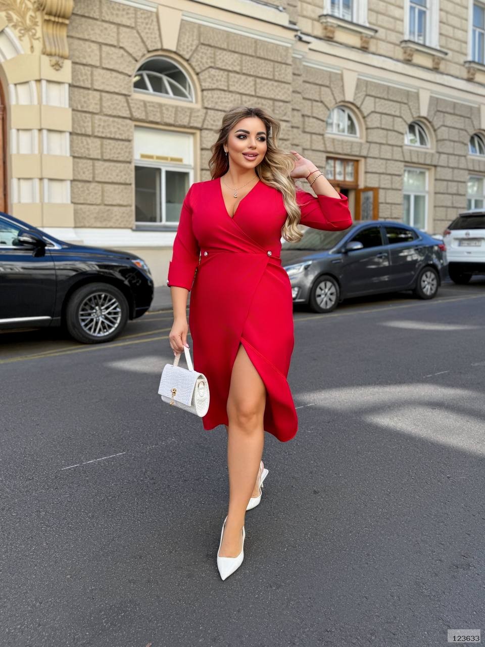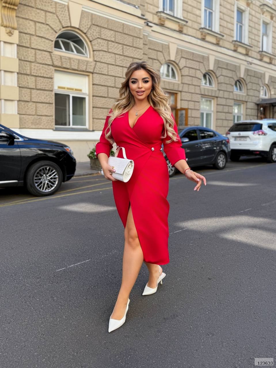 Плаття приталенного крою , ззаду молнія , на талії та рукавах ґудзики , низ та верх плаття на запах.