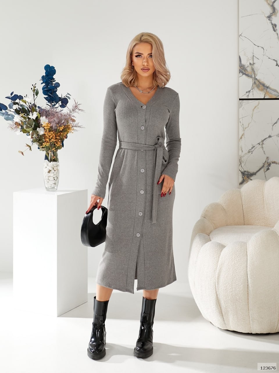 Стильна в'язана сукня міді-довжини з довгим рукавом, що ідеально поєднує елегантність і комфорт. Вона має приталений силует завдяки знімному поясу, що зав’язується на талії. Спереду – ряд ґудзиків по всій довжині, які додають вишуканості та дозволяють регулювати глибину вирізу.