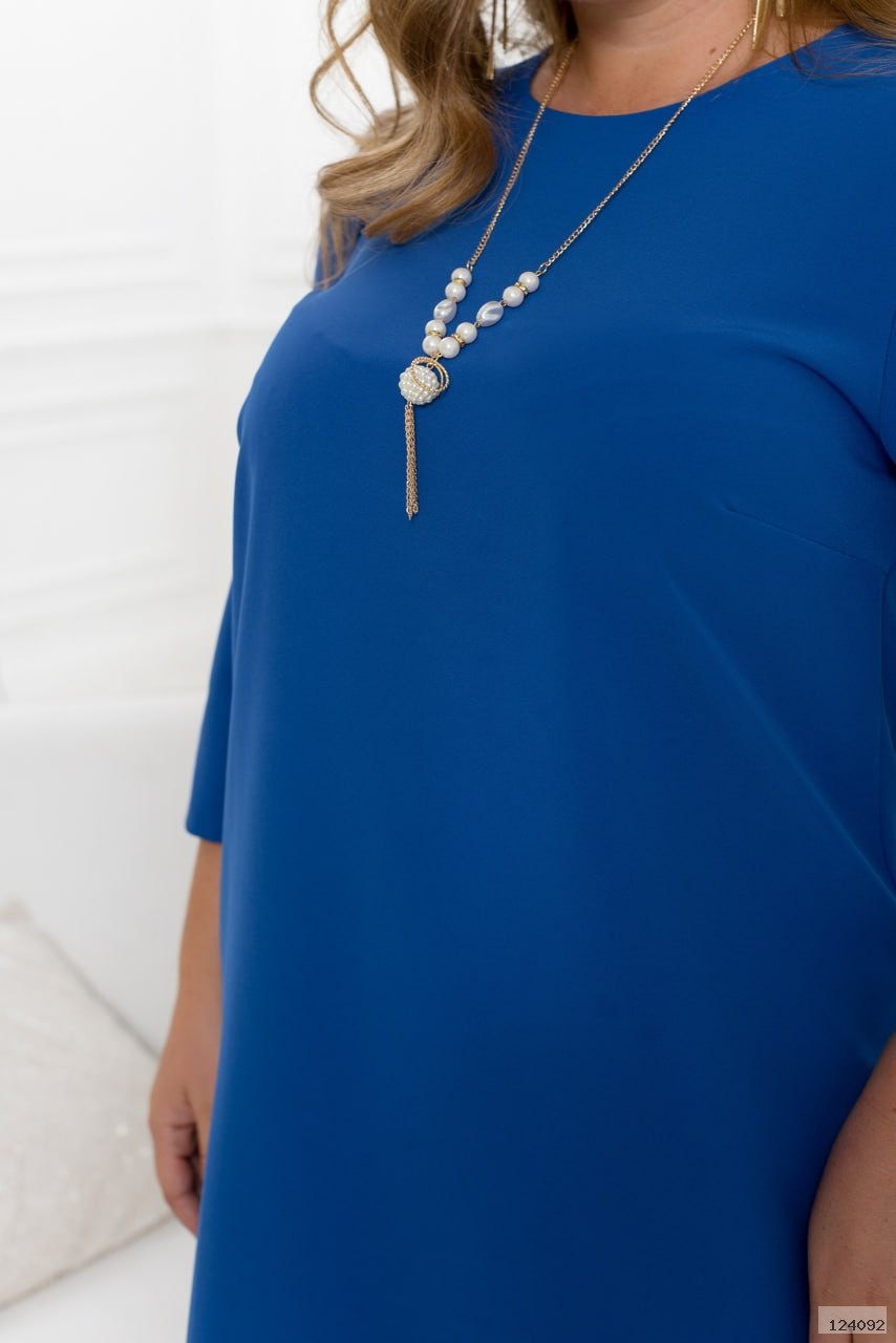 Елегантна та мінімалістична сукня з напівкруглим широким вирізом горловини. Рукав вільний без манжета довжиною 3/4. Застібок немає. На грудях діагональні виточки. Прикраса входить в комплект.