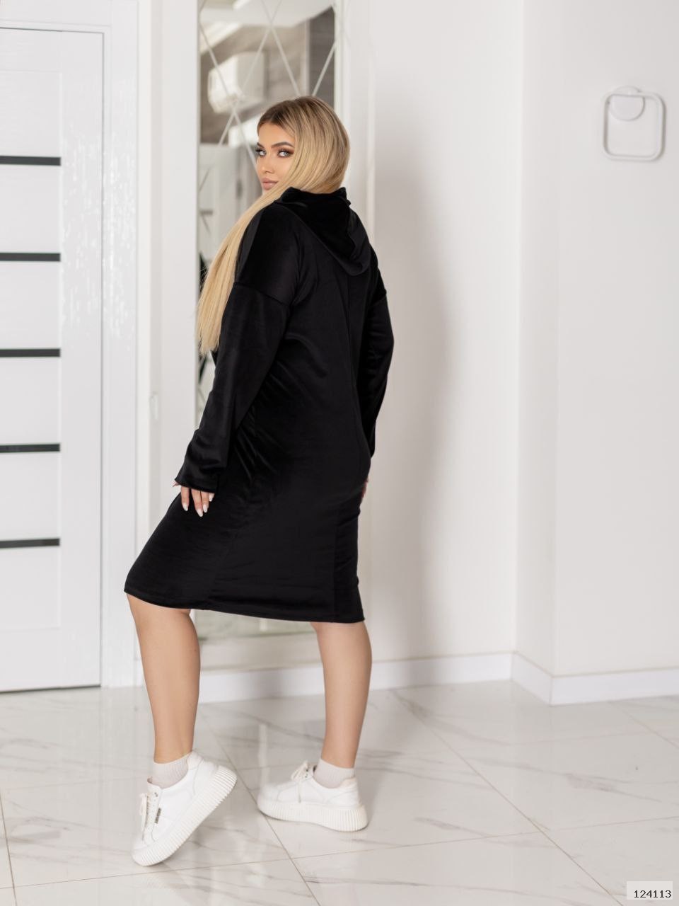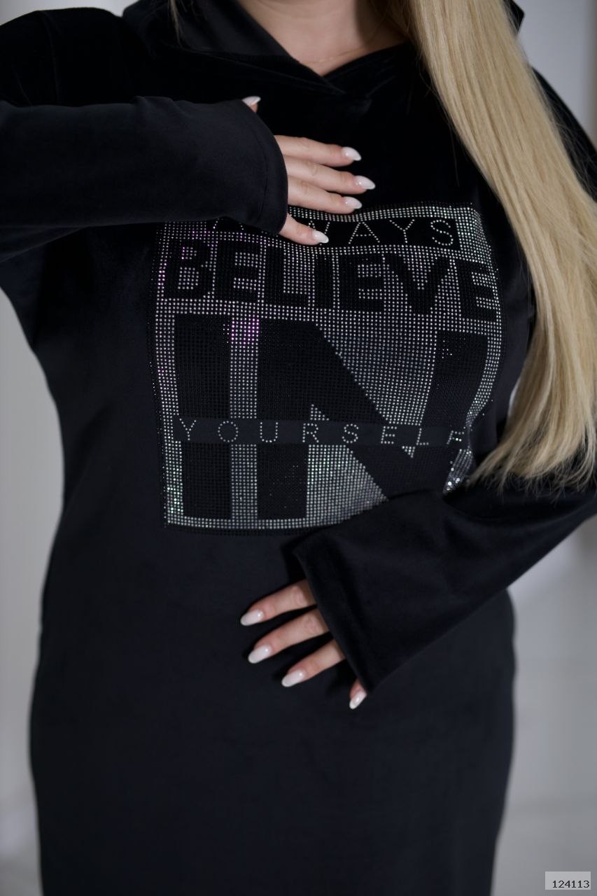 Ця стильна сукня з м’якого велюру — справжній мастхев для осінньо-зимового гардероба. Вона поєднує елегантність сукні та зручність спортивного стилю завдяки оригінальному капюшону та лаконічному крою.