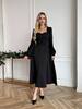 Елегантна міді-сукня із ніжно приталеним силуетом та акцентованим вирізом-сердечком. Довгі об’ємні рукави додають жіночності, а тягнуча тканина забезпечує комфортне та ідеальне прилягання по фігурі. Сукня виглядає святково й водночас стримано — чудовий вибір для урочистостей, вечірок або святкових подій.