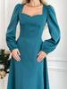 Елегантна міді-сукня із ніжно приталеним силуетом та акцентованим вирізом-сердечком. Довгі об’ємні рукави додають жіночності, а тягнуча тканина забезпечує комфортне та ідеальне прилягання по фігурі. Сукня виглядає святково й водночас стримано — чудовий вибір для урочистостей, вечірок або святкових подій.