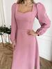 Елегантна міді-сукня із ніжно приталеним силуетом та акцентованим вирізом-сердечком. Довгі об’ємні рукави додають жіночності, а тягнуча тканина забезпечує комфортне та ідеальне прилягання по фігурі. Сукня виглядає святково й водночас стримано — чудовий вибір для урочистостей, вечірок або святкових подій.