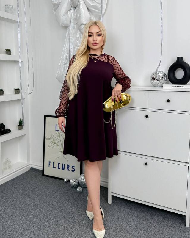 Елегантна сукня, яка має прямий вільний крій, що гарно сідає на будь-яку фігуру. Родзинка виробу — прозорі сітчасті вставки з малюнком у клітинку на рукавах та в зоні декольте, які додають образу вишуканості та ніжності.