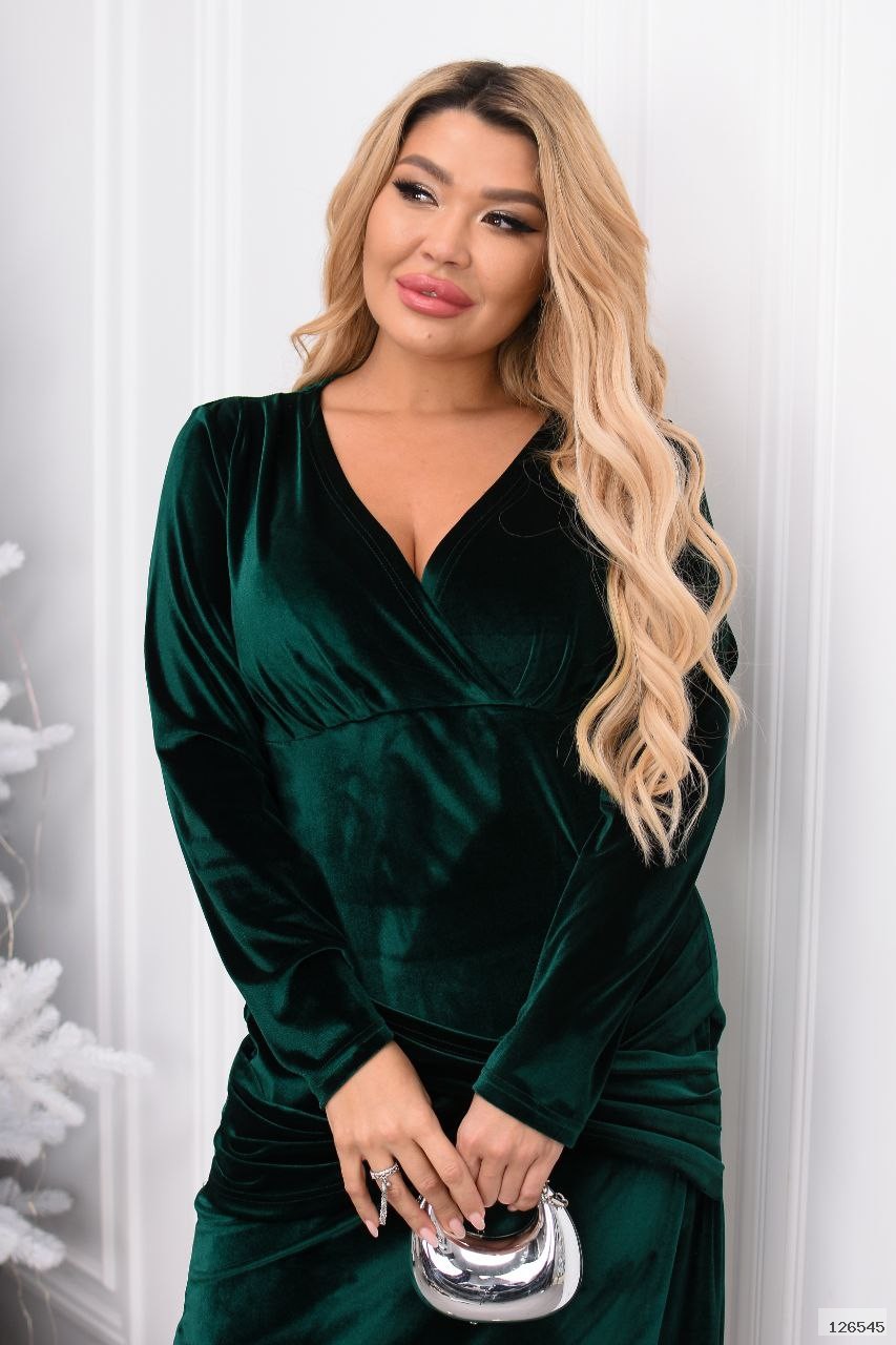 Елегантна приталена сукня із запахом, яка красиво підкреслює фігуру. Тканина — м’який еластичний бархат, що виглядає розкішно та забезпечує ідеальну посадку.