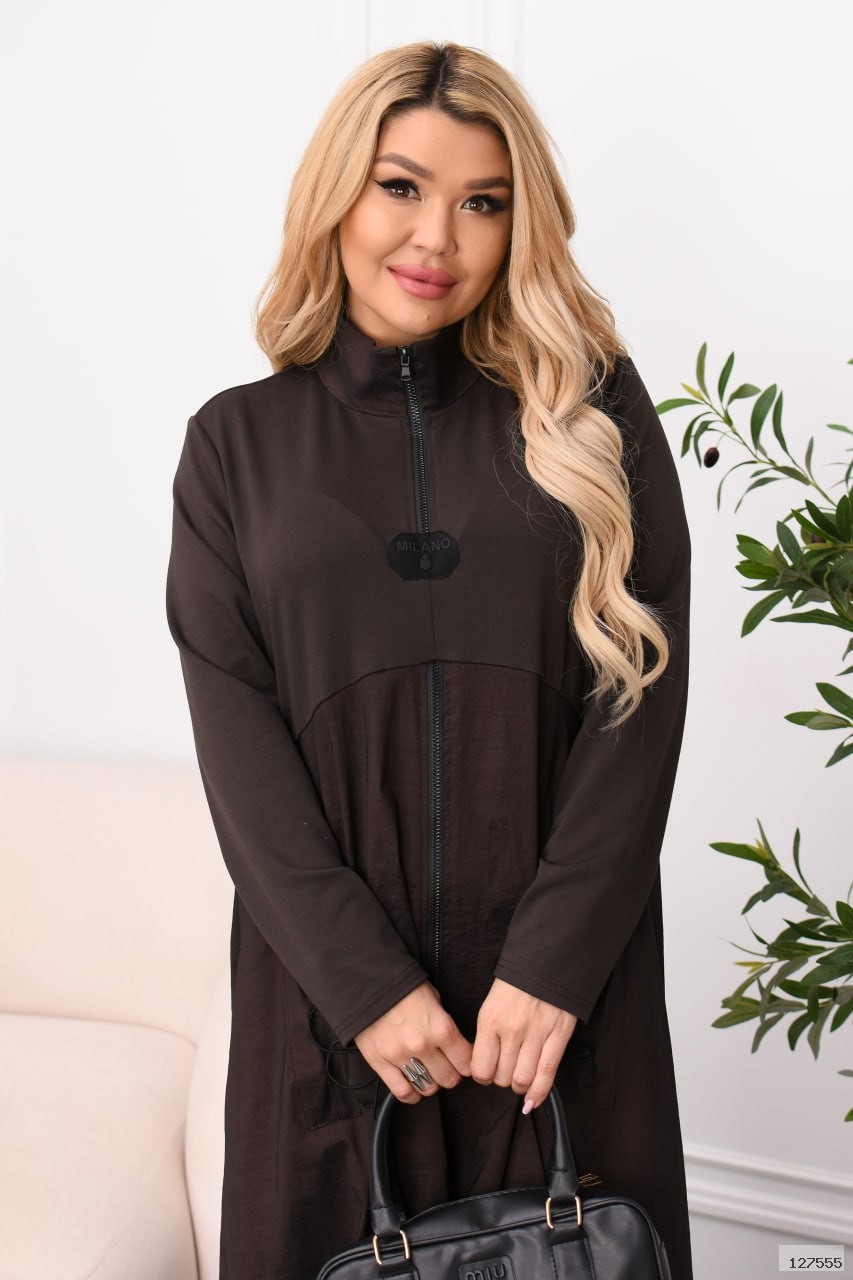 Легка елегантність з акцентом на комфорт: спортивні деталі зустрічаються з міським шиком. Стійка-горловина з блискавкою до рівня грудей + окрема блискавка від грудей донизу, комбінована фактура (двонитка + жатa плащівка), дві накладні кишені. Ззаду — декоративна шнурівка для регулювання об’єму на талії. Низ на резинці для охайної посадки.