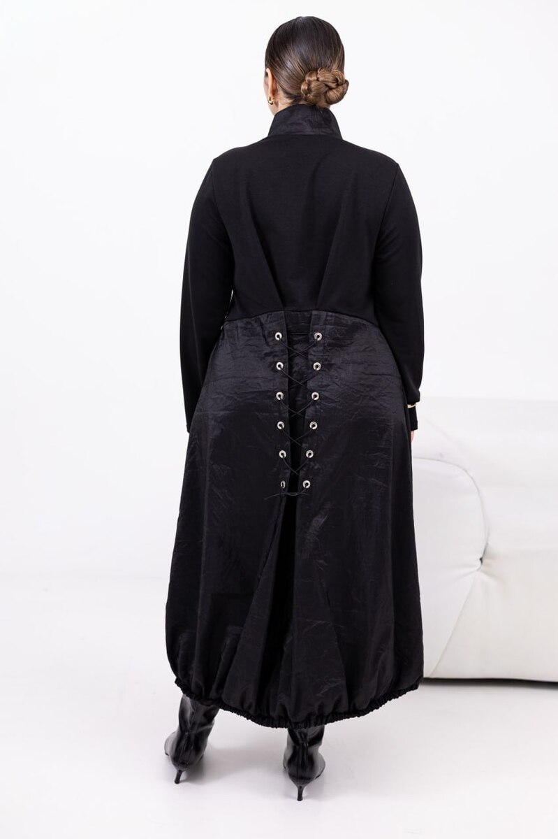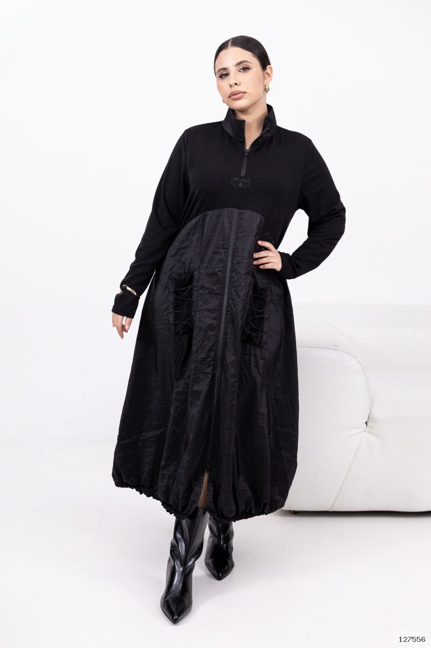 Легка елегантність з акцентом на комфорт: спортивні деталі зустрічаються з міським шиком. Стійка-горловина з блискавкою до рівня грудей + окрема блискавка від грудей донизу, комбінована фактура (двонитка + жатa плащівка), дві накладні кишені. Ззаду — декоративна шнурівка для регулювання об’єму на талії. Низ на резинці для охайної посадки.