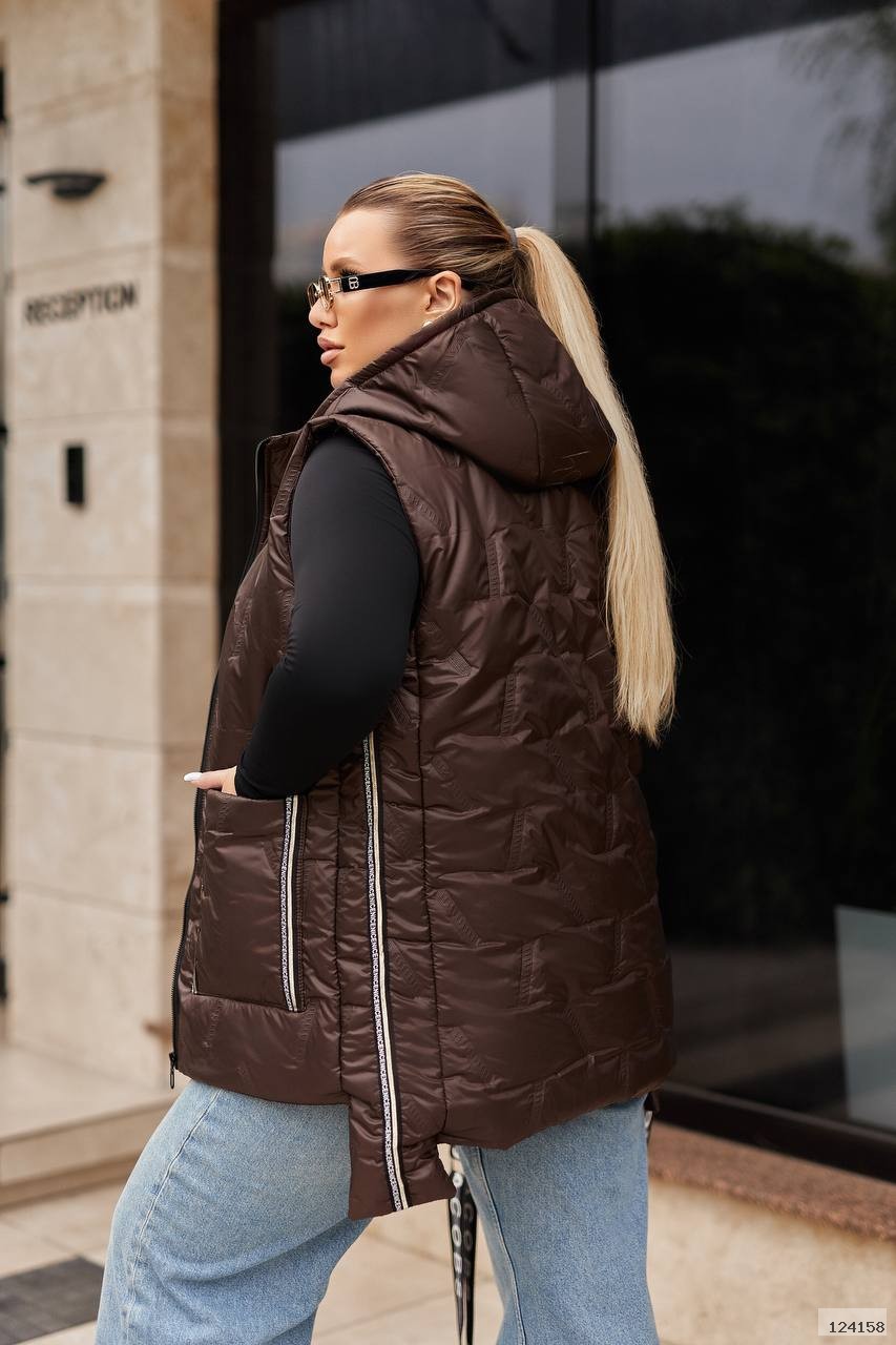 Стильний жилет з капюшоном. Застібка-молнія спереду по центру, з боків- накладні кишені. Жилет з боків і кишені прострочений декорованою тасьмою.