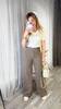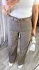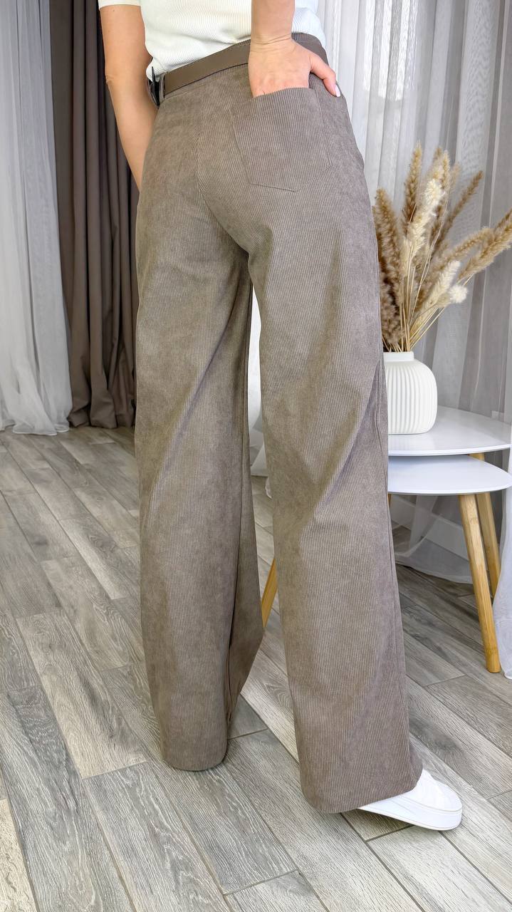 Штани з мʼякої еластичної тканини, тягнуться, з двома кишенями попереду, позаду 1 кишеня, застібаються на ґудзик та блискавку.