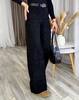 Штани з мʼякої еластичної тканини, тягнуться, з двома кишенями попереду, позаду 1 кишеня, застібаються на ґудзик та блискавку.