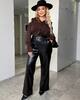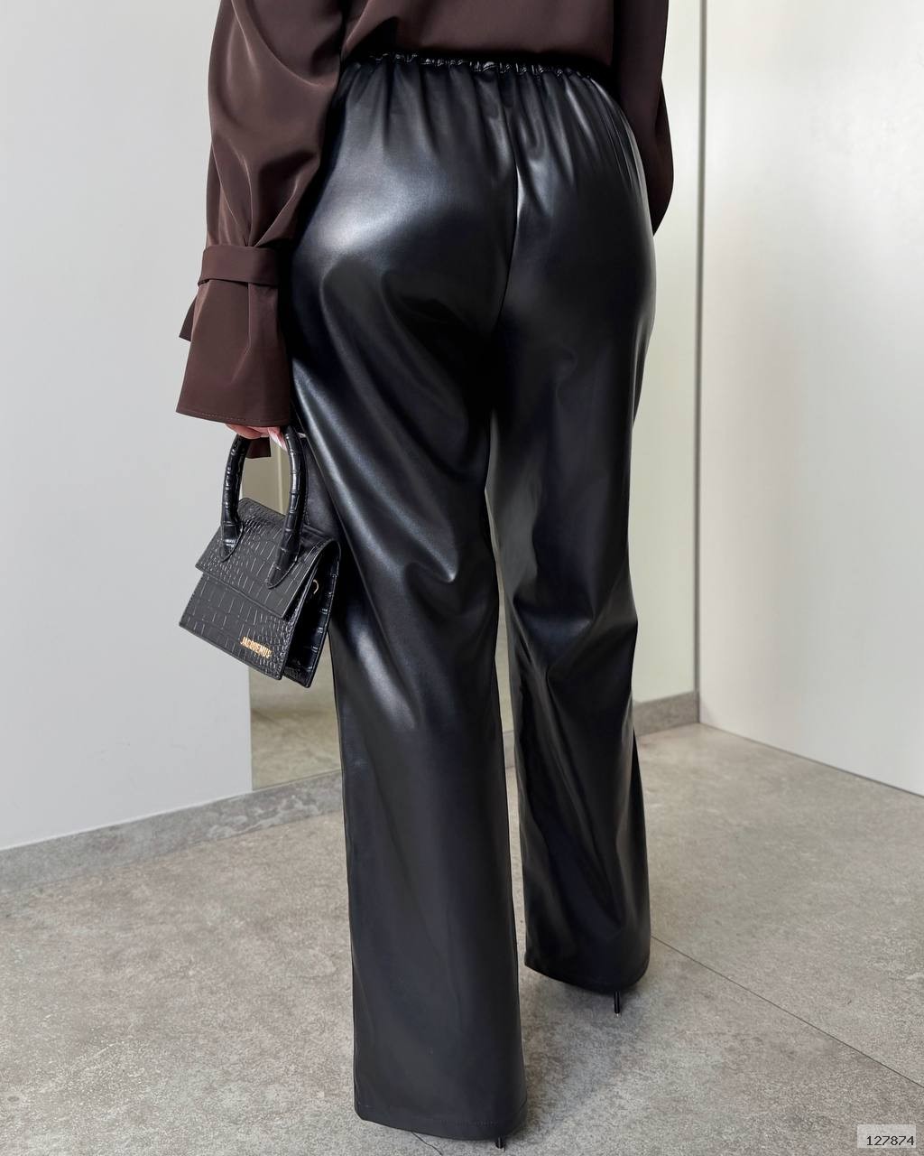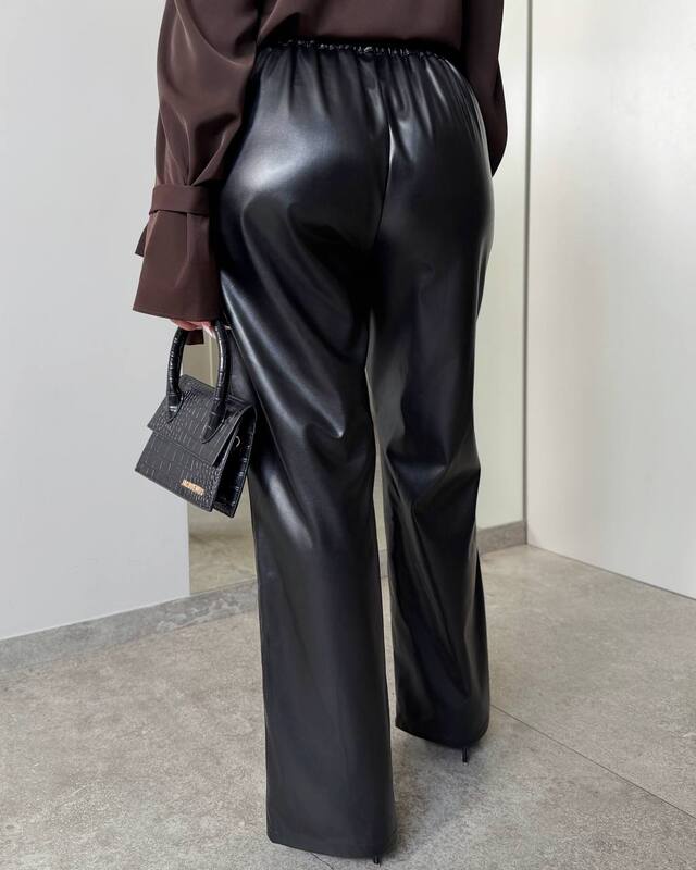 БРЮКИ ПРЯМОГО КРОЮ з еко шкіри на байковій основі Брюки високої посадки з косими кишенями. Зі строчкою по переду. Пояс частково на резинці, застібка гачок.