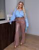 БРЮКИ ПРЯМОГО КРОЮ з еко шкіри на байковій основі Брюки високої посадки з косими кишенями. Зі строчкою по переду. Пояс частково на резинці, застібка гачок.