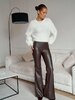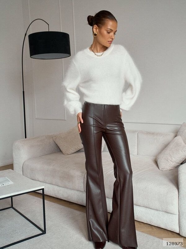 Жіночі брюки з екошкіри з високою посадкою — стильна та трендова модель для створення ефектних образів. Виконані з якісної екошкіри, приємної на дотик, добре тримає форму та красиво сідає по фігурі. Висока посадка візуально подовжує ноги й підкреслює талію. Позаду пояс на резинці для ідеальної посадки. Лаконічний дизайн без кишень додає елегантності та мінімалізму. Ідеально поєднуються як з базовими речами, так і з яскравими акцентами.