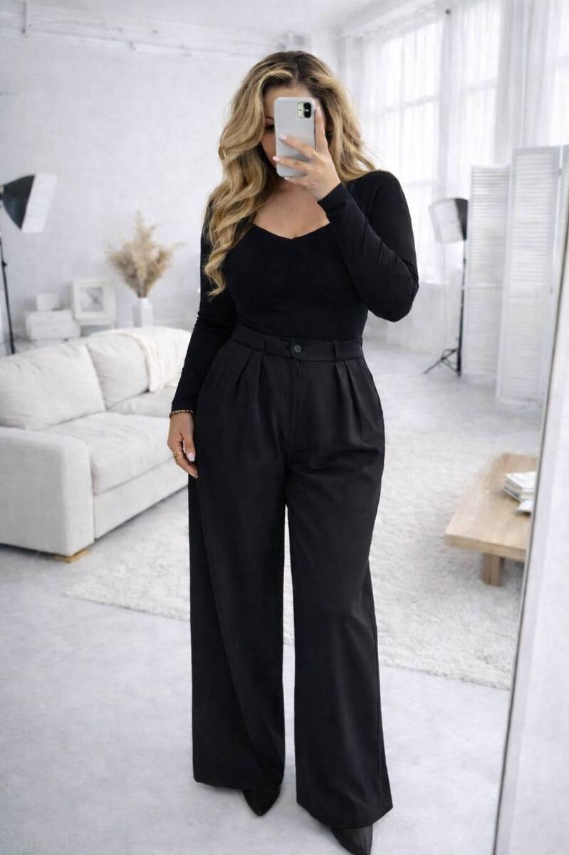 Брюки палаццо. Широкий крій візуально подовжує ноги, висока посадка підкреслює талію. Щільна костюмна тканина не мнеться, добре тримає форму. Фігура виглядає стрункішою. Розтяжність мінімальна На талії блискавка, позаду резинка.