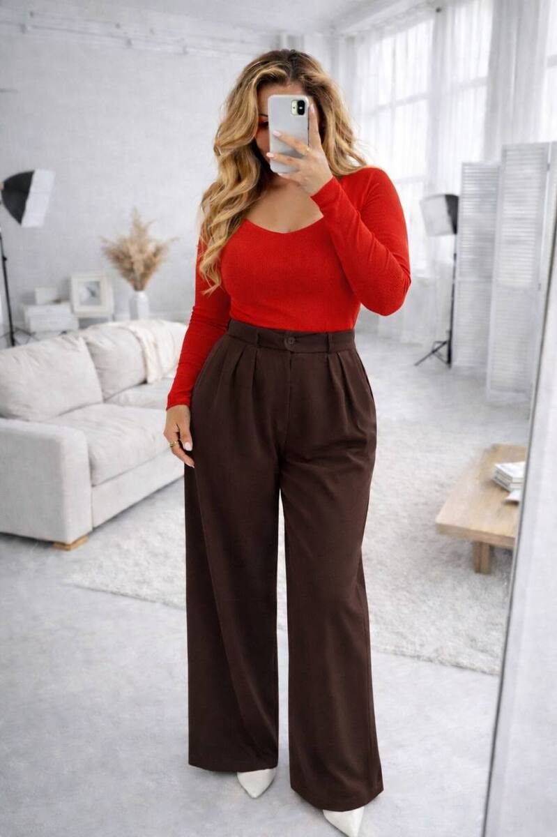 Брюки палаццо. Широкий крій візуально подовжує ноги, висока посадка підкреслює талію. Щільна костюмна тканина не мнеться, добре тримає форму. Фігура виглядає стрункішою. Розтяжність мінімальна На талії блискавка, позаду резинка.