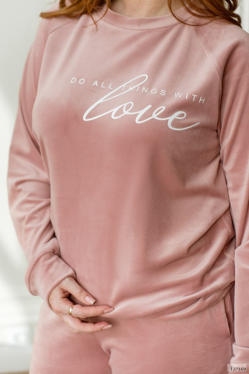 М'який і зручний домашній костюм, виконаний з шовковистого велюру, дозволить вам відчувати себе максимально комфортно і привабливо. У комплект входять однотонні штани-джогери на резинці з кишенями і манжетами, а також лаконічний світшот в тон з декоративним принтом і рукавами-реглан, доповненими манжетами.