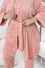 Стильний та комфортний костюм-трійка батал. В комплекті халат з кишенями по сторонам, декорований візерунком зі страз на спині, застібок немає, в комплекті пасок, для нього - дві шлівки по сторонам. Футболка без застібок та кишень, на грудях - візерунок зі страз. Горловина півкругла, рукава з невеликими м'якими манжетами. Брюки з високою талією, вшитою до пояса резинкою та кишенями в швах.