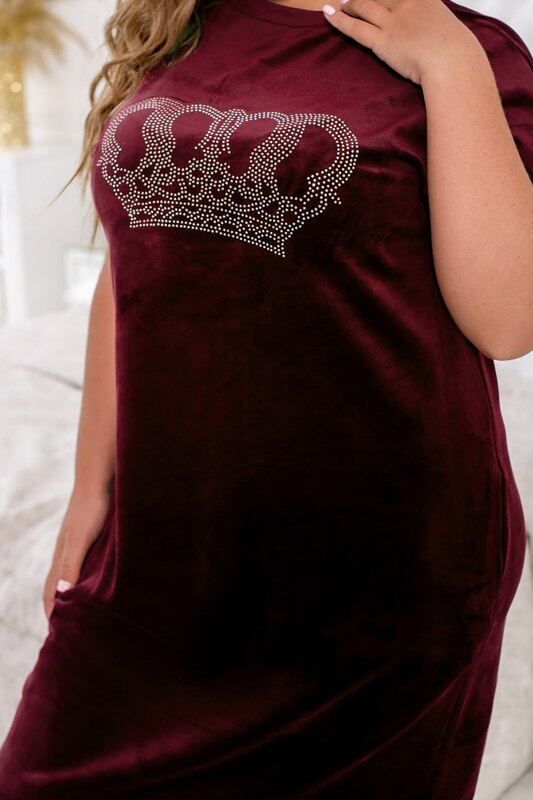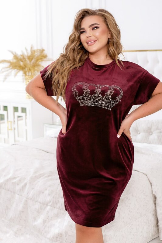 Елегантна домашня сукня без застібок, рукави без манжетів, по сторонам - кишені в шві. На грудях - великий декоративний візерунок зі страз.
