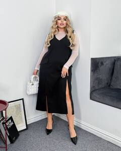Нарядний комплект : плаття без рукавів , з боків дві кишені -імітації , спереду два розрізи вище колін, V-образний виріз; гольф з довгим рукавом.