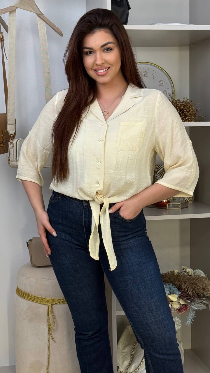 Стильна, повітряна та дуже зручна блуза з натуральної тканини, яка не сковує рухів. Модель з жіночним силуетом, акцентом на талії завдяки трендовому вузлу-зав’язці. Рукав 3/4 із можливістю фіксації