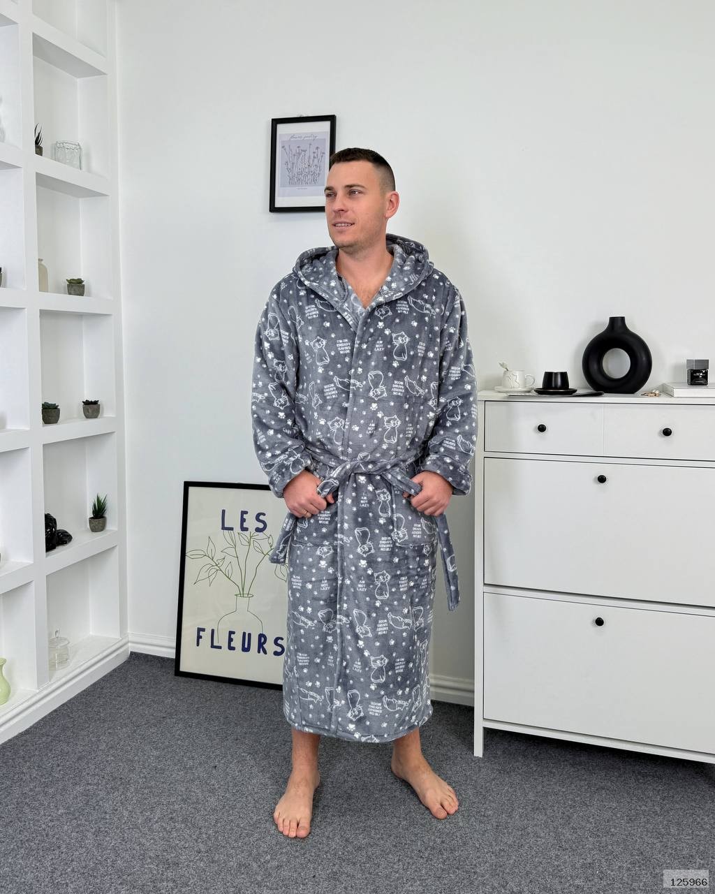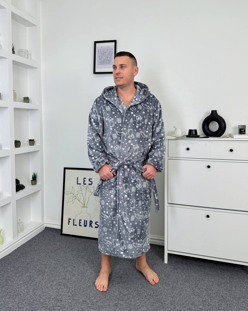 Халат з капюшоном має пояс і зручні кишені.