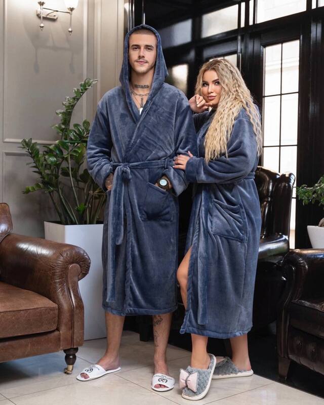 Халат з капюшоном має пояс і зручні кишені.