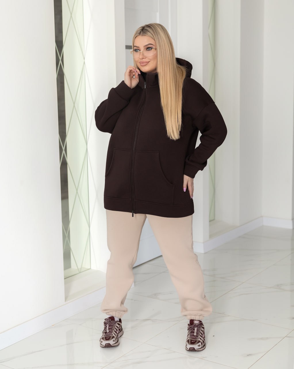 Стильний, теплий зуді на змійці. Подвійний капюшон, манжети рукавів та пояса - з основної тканини.
