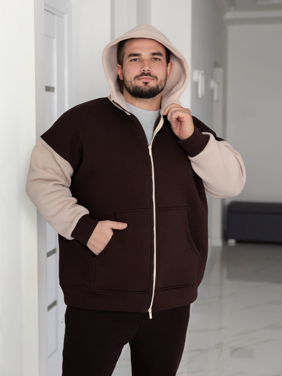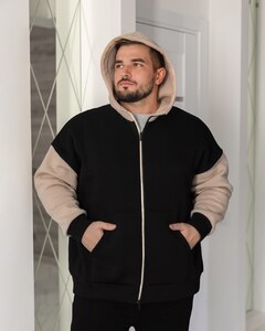 Стильний, теплий зуді на змійці. Подвійний капюшон, манжети рукавів та пояса - з основної тканини.