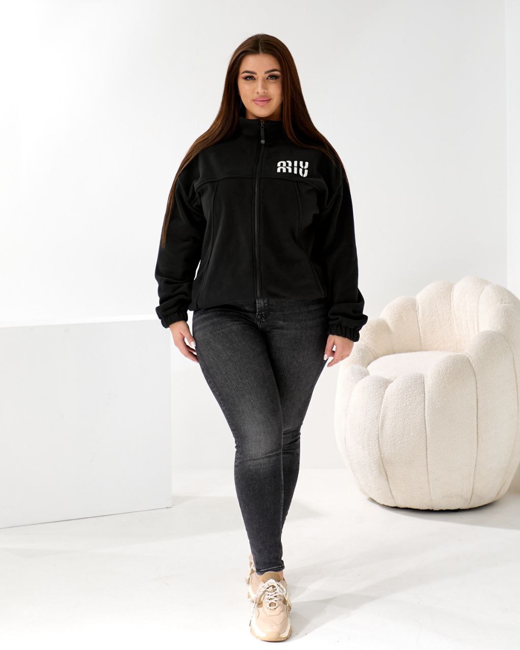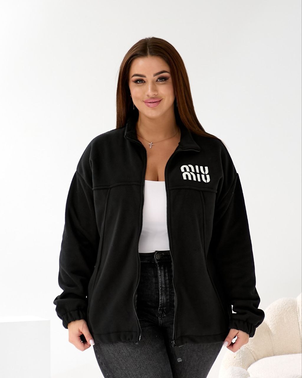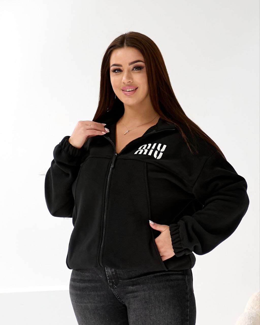 Комірець-стійка.Застібка на блискавці,по низу виробу резинка на стопорах,дає можливість стягувати низ кофти,або носити прямий силует.Рукава по низу на резинці.