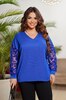 Ефектний джемпер вільного силуету. Джемпер виконаний у техніці "ручного в'язання" з ангори. V-подібний виріз виробу оброблений двосторонніми планками. Рукав у виробі спущений на манжеті по низу, виконаний з сітки з напиленням флока. Спинка у виробі без особливостей. Низ джемпера оброблений притачною планкою із основної тканини.