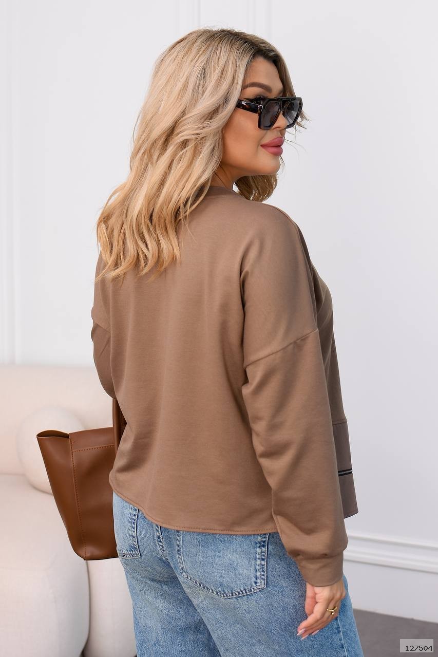Кофта вільного, цікавого крою : по низу вставка з крепкостюмки , прикрашена молнією з канатом в колір основи . На рукавах манжети . Цікавий крій , який приховує недоліки фігури