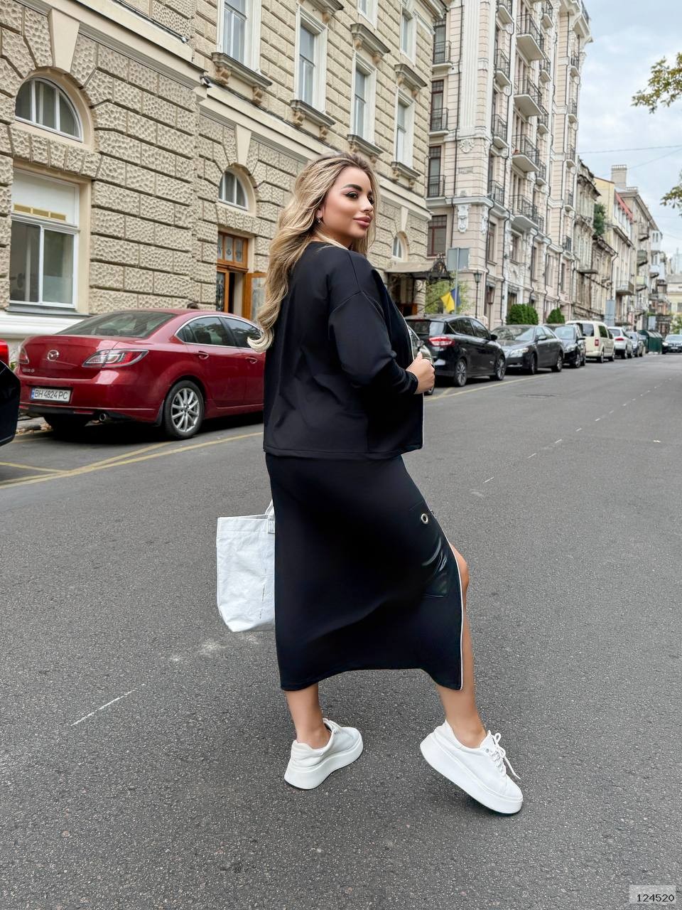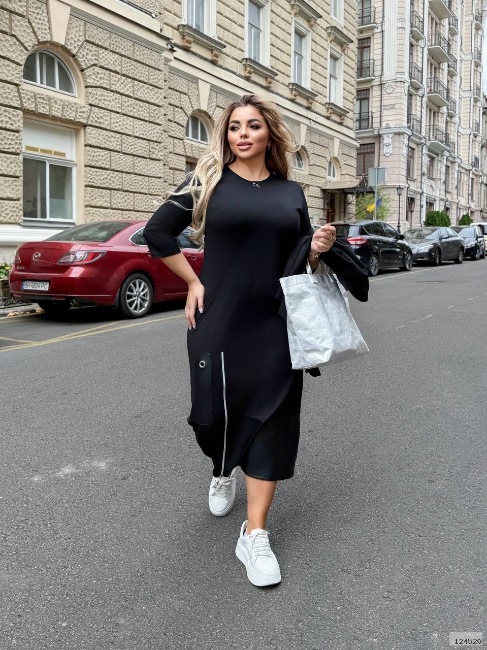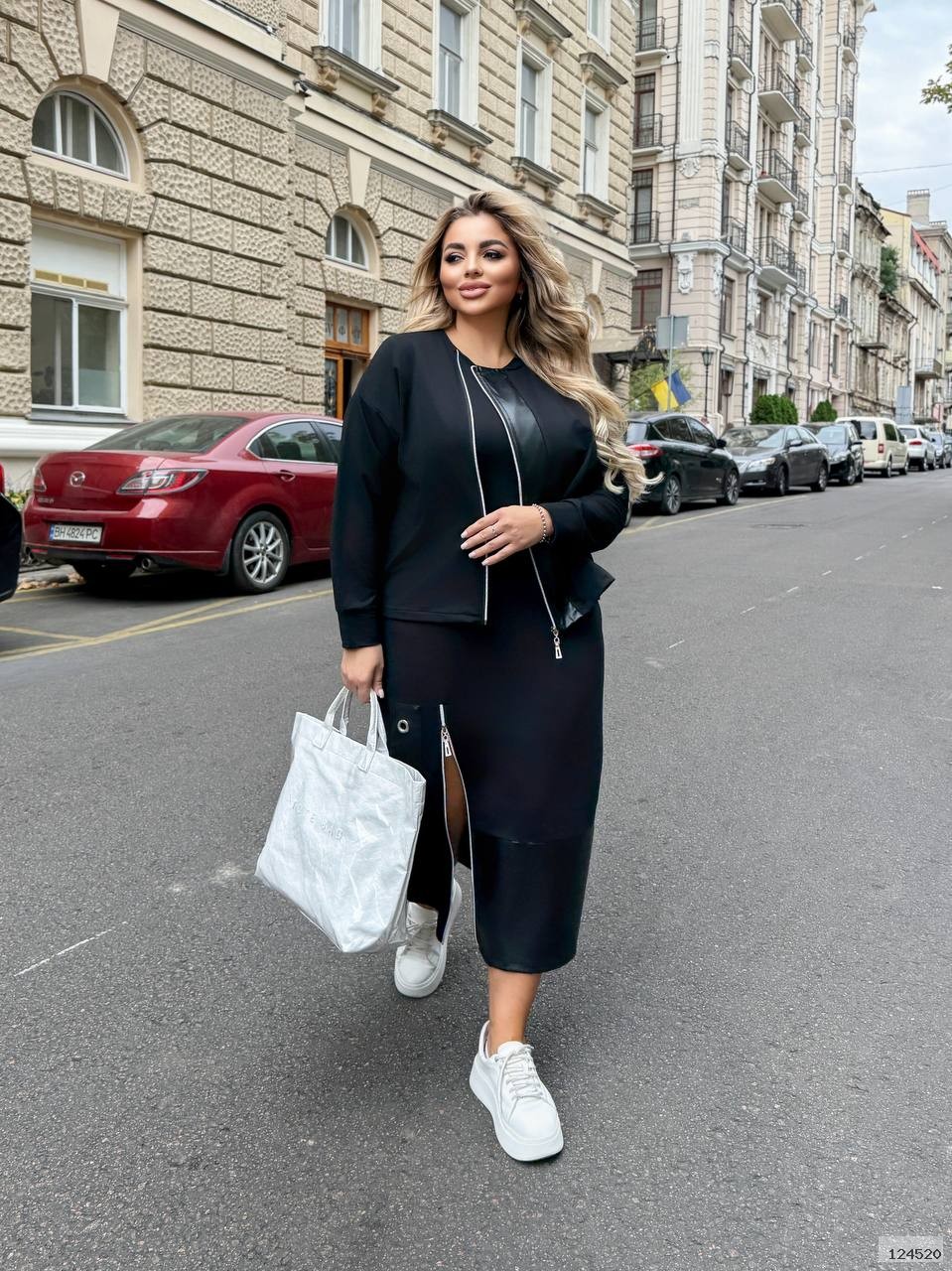 Костюм-двійка виконаний з якісної двонитки+екошкіри, яка не полиняє. Сукня має рукав 3/4, знизу молнія, яка візуально подовжує ніжку, біля неї гарна блочка. Кофта на молнії