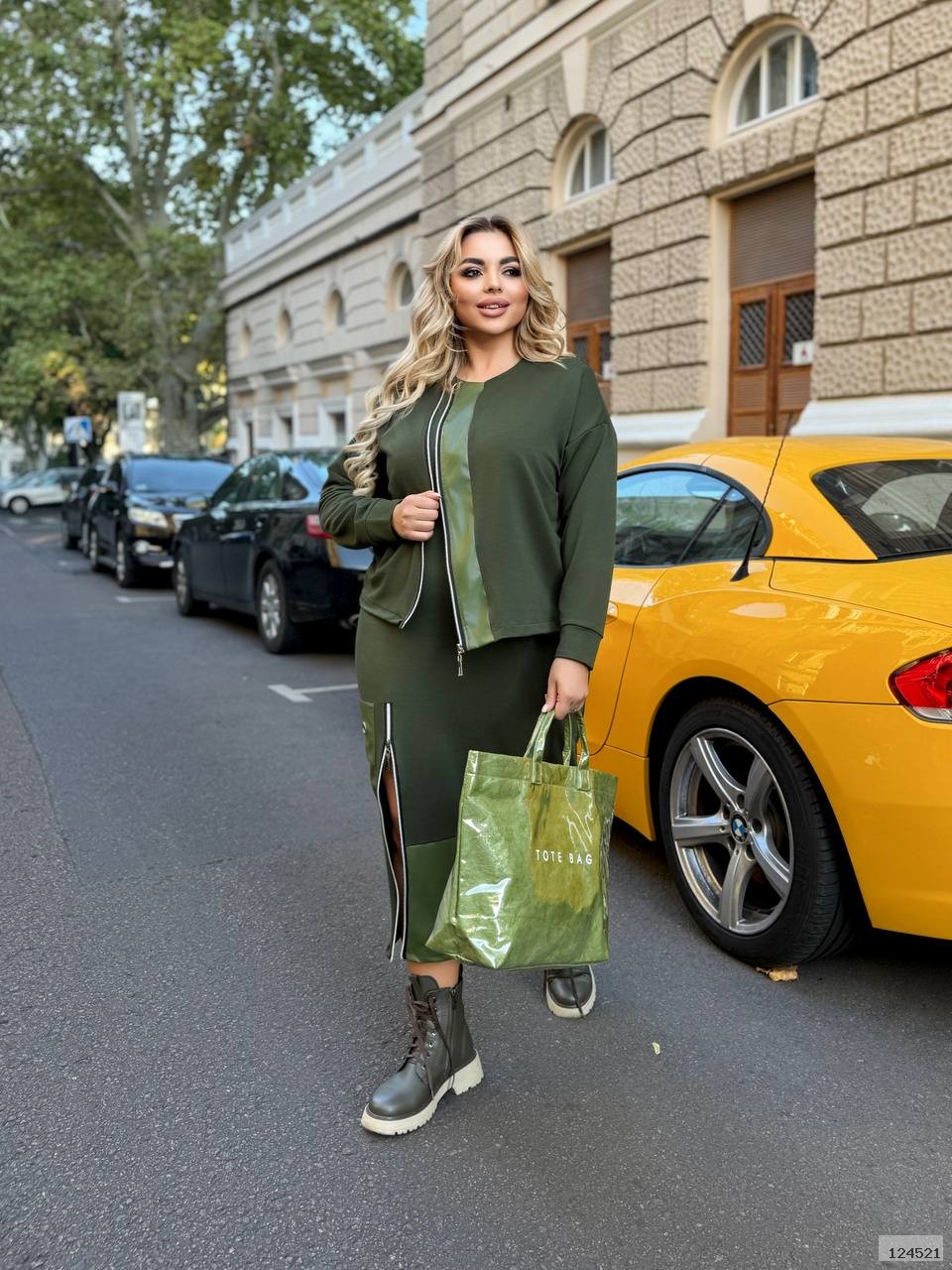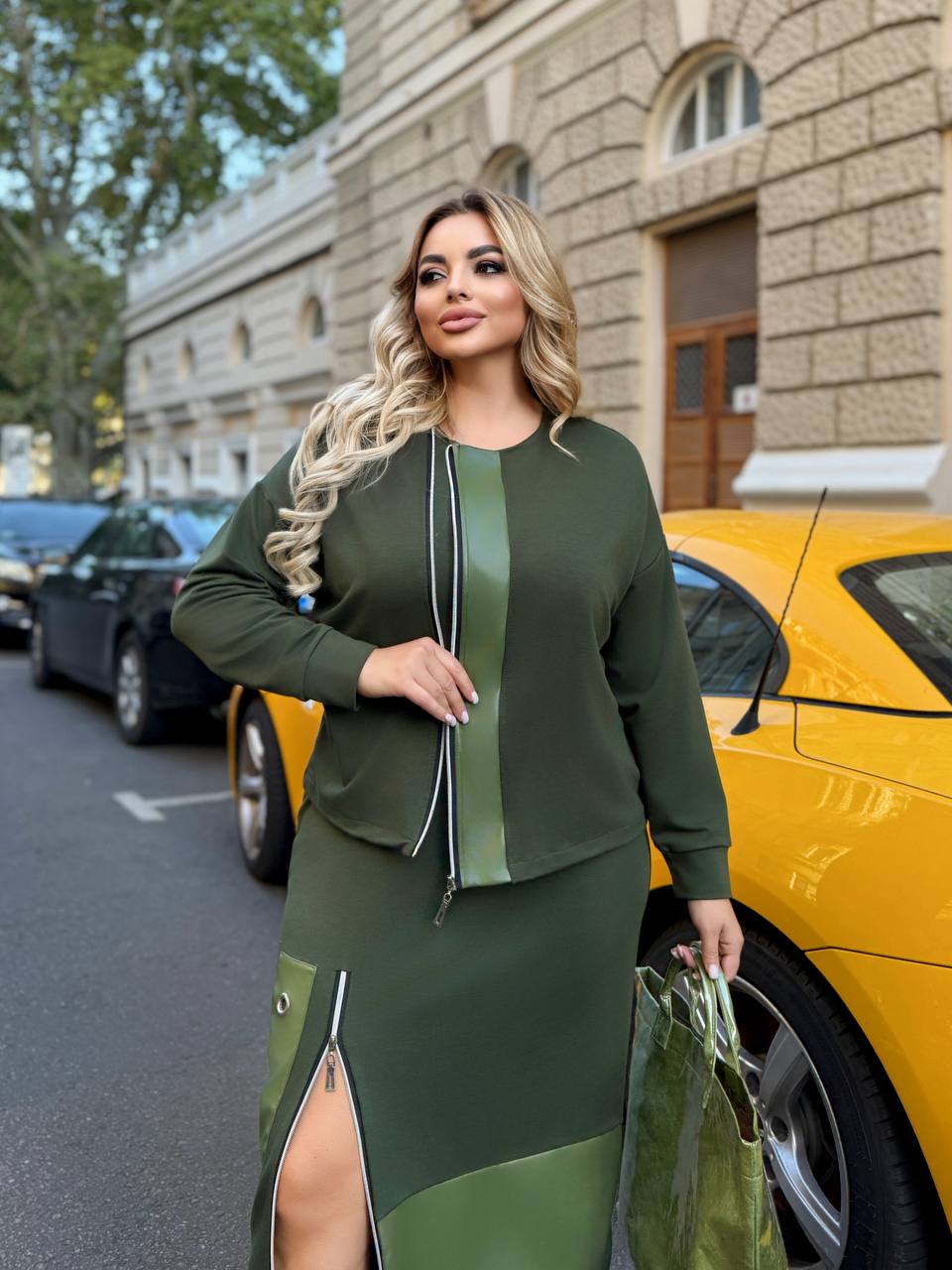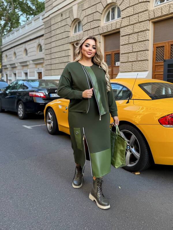 Костюм-двійка виконаний з якісної двонитки+екошкіри, яка не полиняє. Сукня має рукав 3/4, знизу молнія, яка візуально подовжує ніжку, біля неї гарна блочка. Кофта на молнії