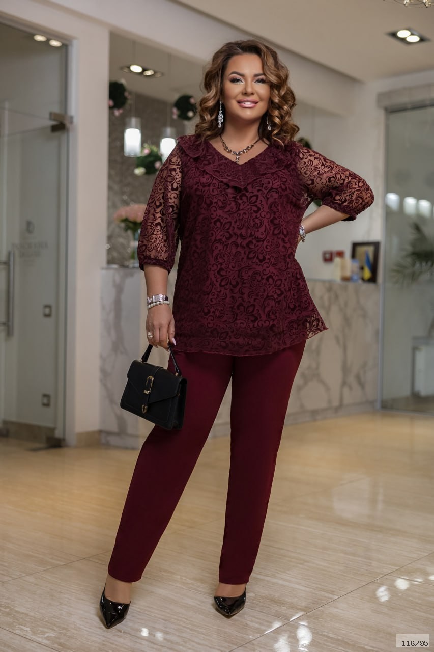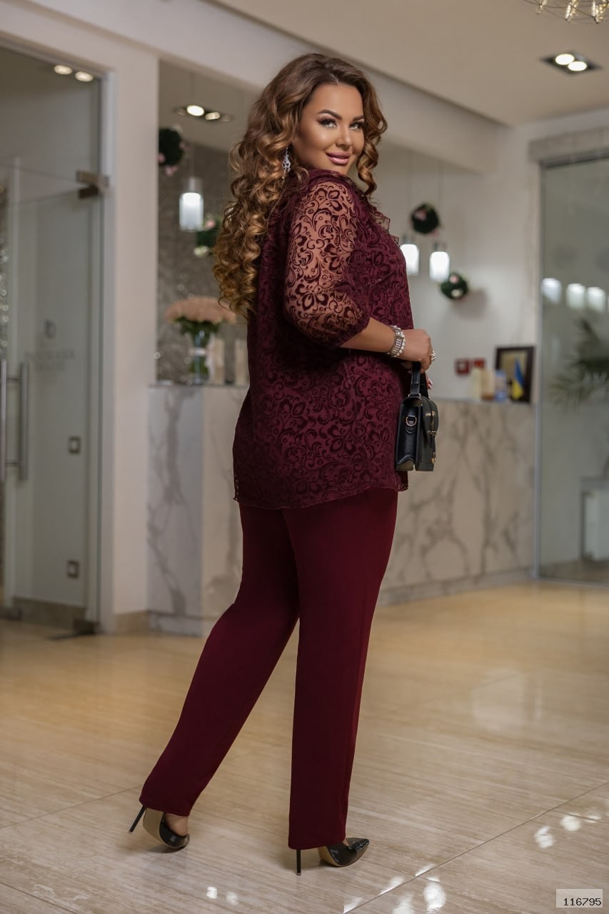 Вишуканий костюм для справжньої леді, що поєднує в собі елегантність та сучасний стиль. Цей костюм підійде для будь-яких заходів: від офісних буднів до світських виходів. Комплект призначений як для ошатного, так і для повсякденного носіння. . Рукав втачний, вільний 3/4. Штани злегка звужені донизу. Прекрасний вибір для вашого образу, який поєднує в собі красу та зручність.
