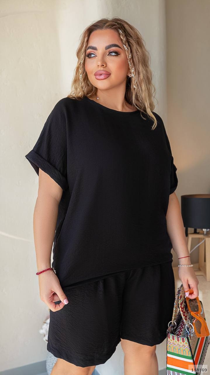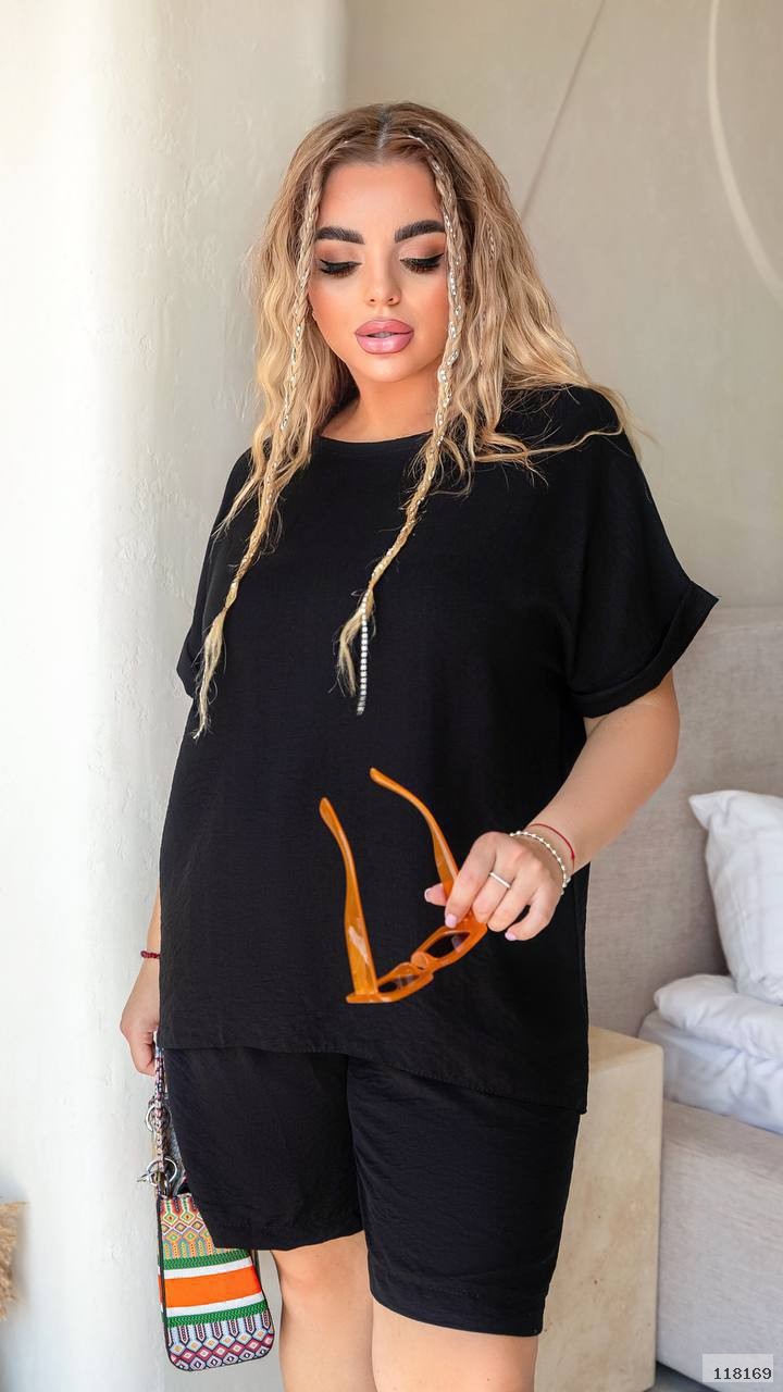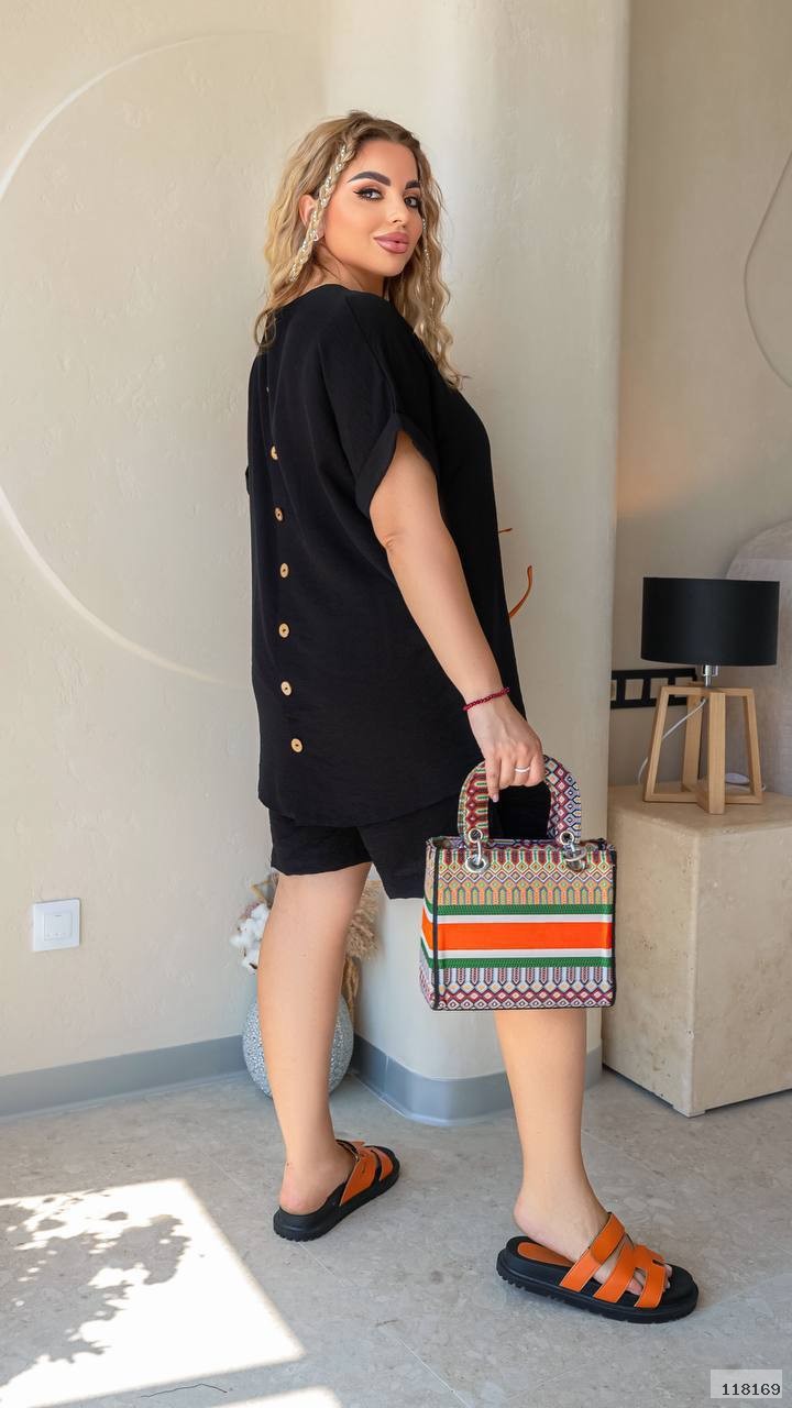 Футболка вільного крою. Спинка декорована ґудзиками. Ззаду футболка довша, перед коротший