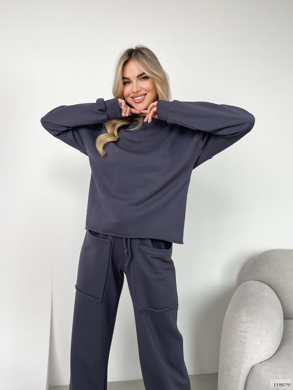 Світшот вільного крою, нижній манжет не оброблений. Горловина та манжети на рукавах з кашкорсе.
