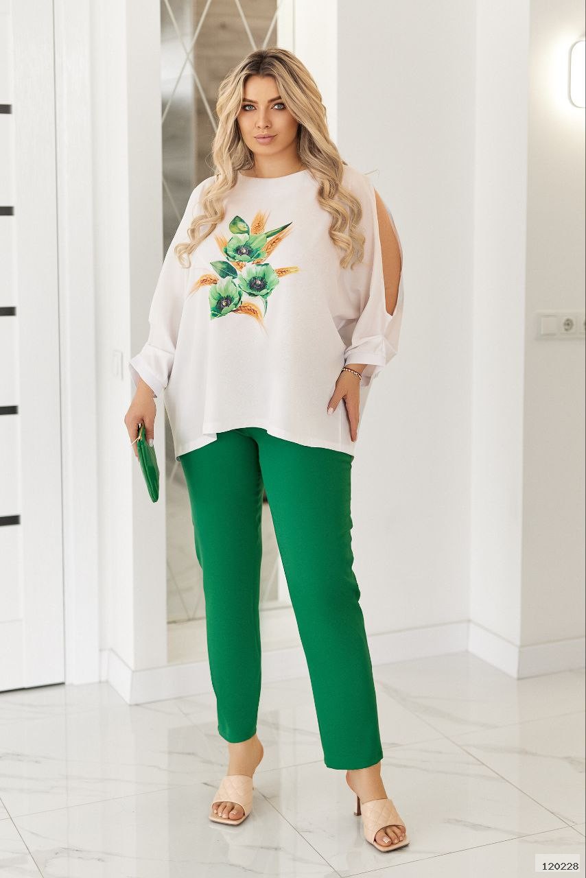 | Ткань: | Блузка- Софт. Брюки- костюмка діагональ + принт |