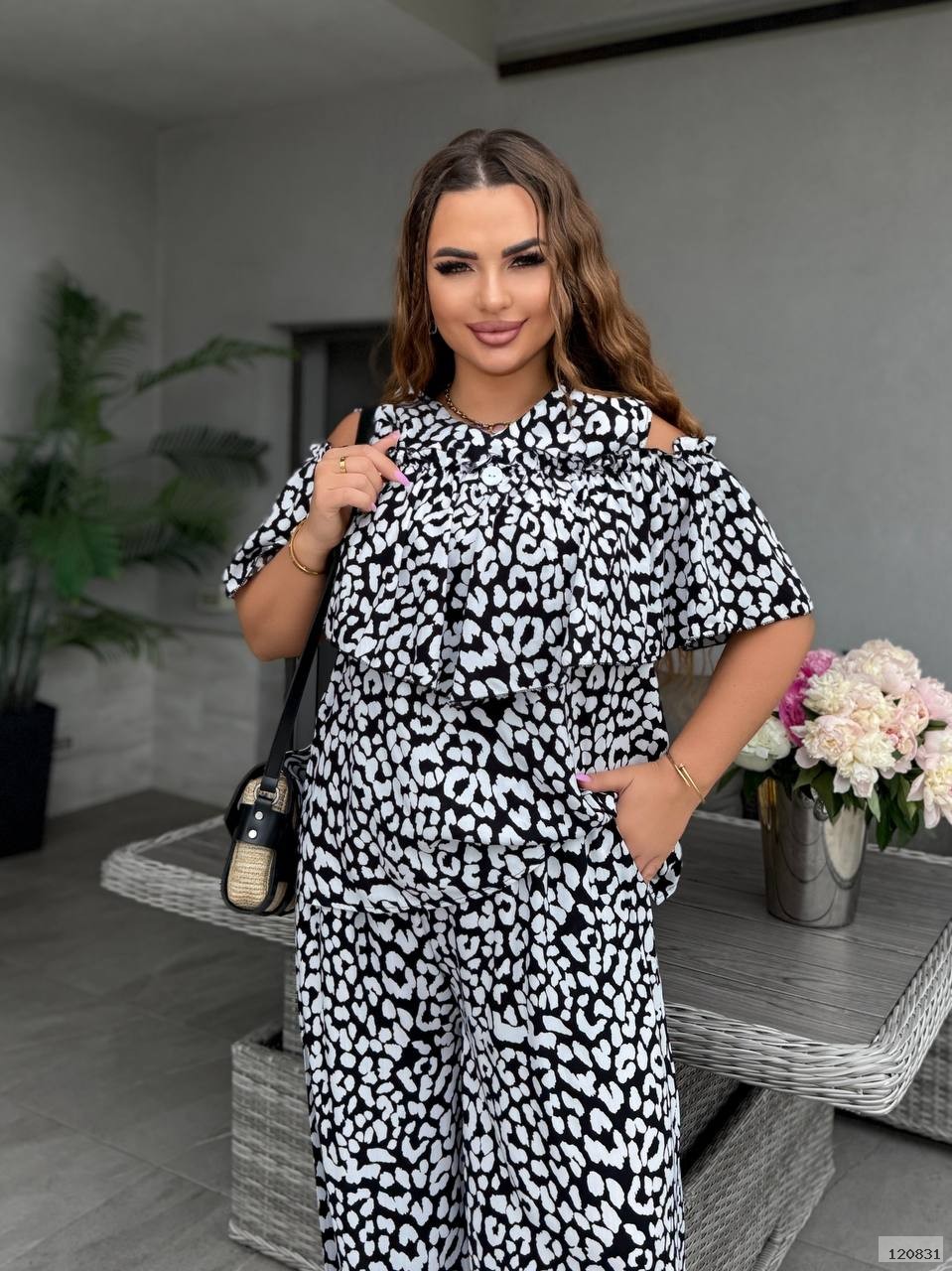 Костюм складається з вільного верху з короткими рукавами і оборками у вирізу, а також широких штанів з високою талією і розкльошеними штанинами, що створюють відчуття легкості та тканини, що струмує. Верх трохи вкорочений і заправлений у штани, акцентуючи талію.