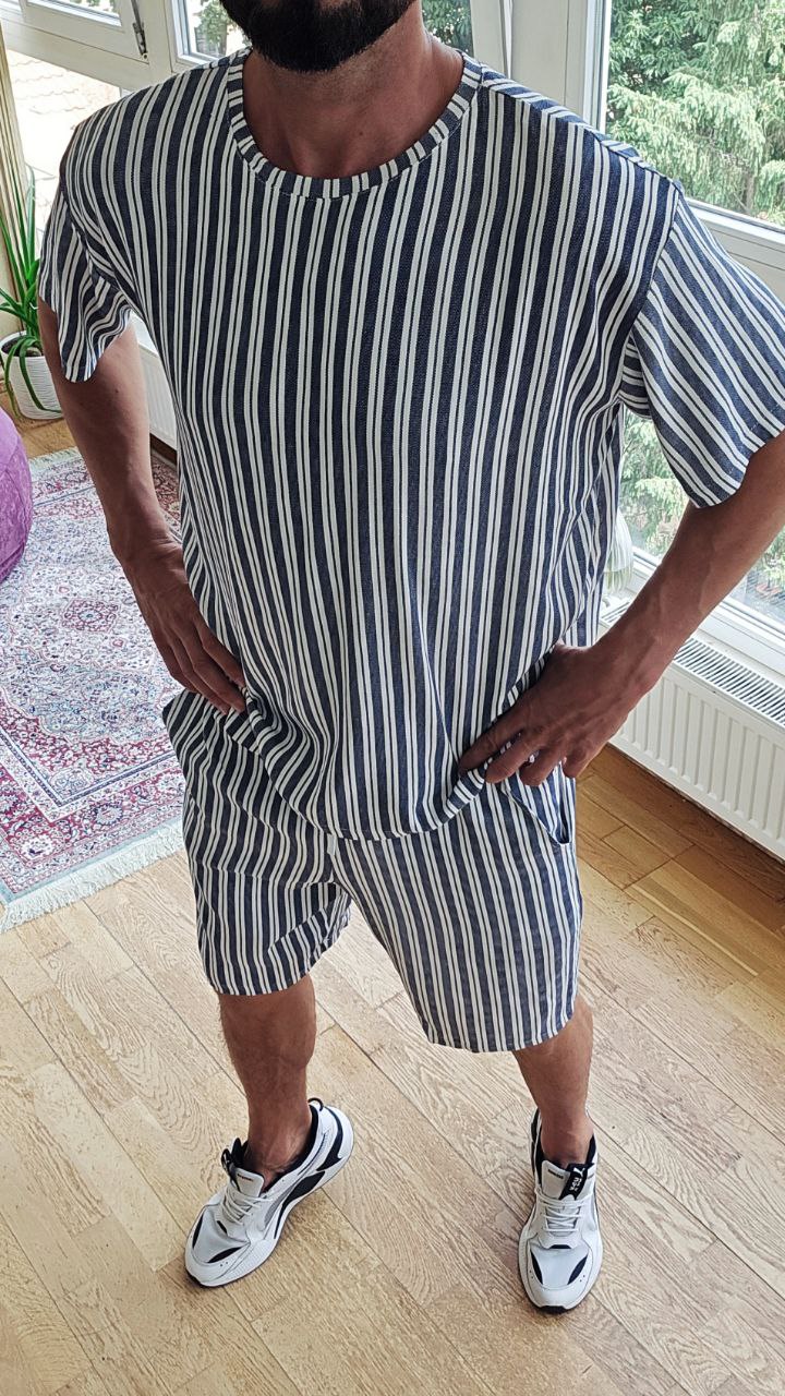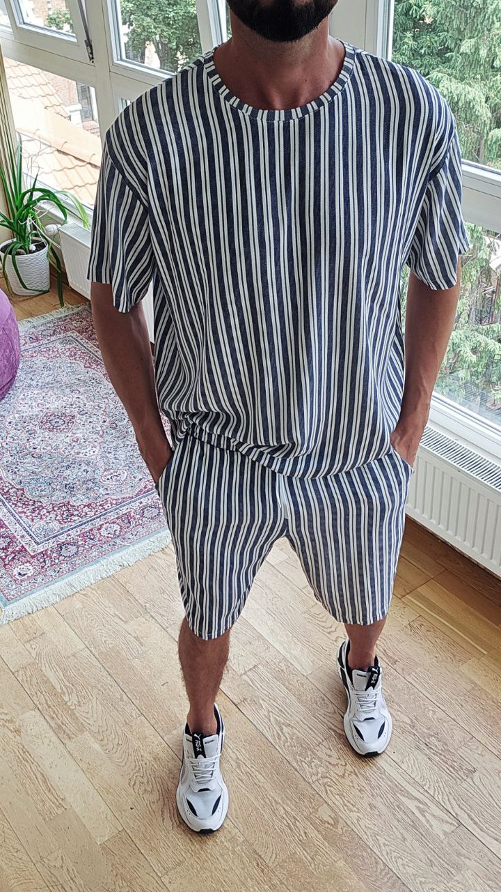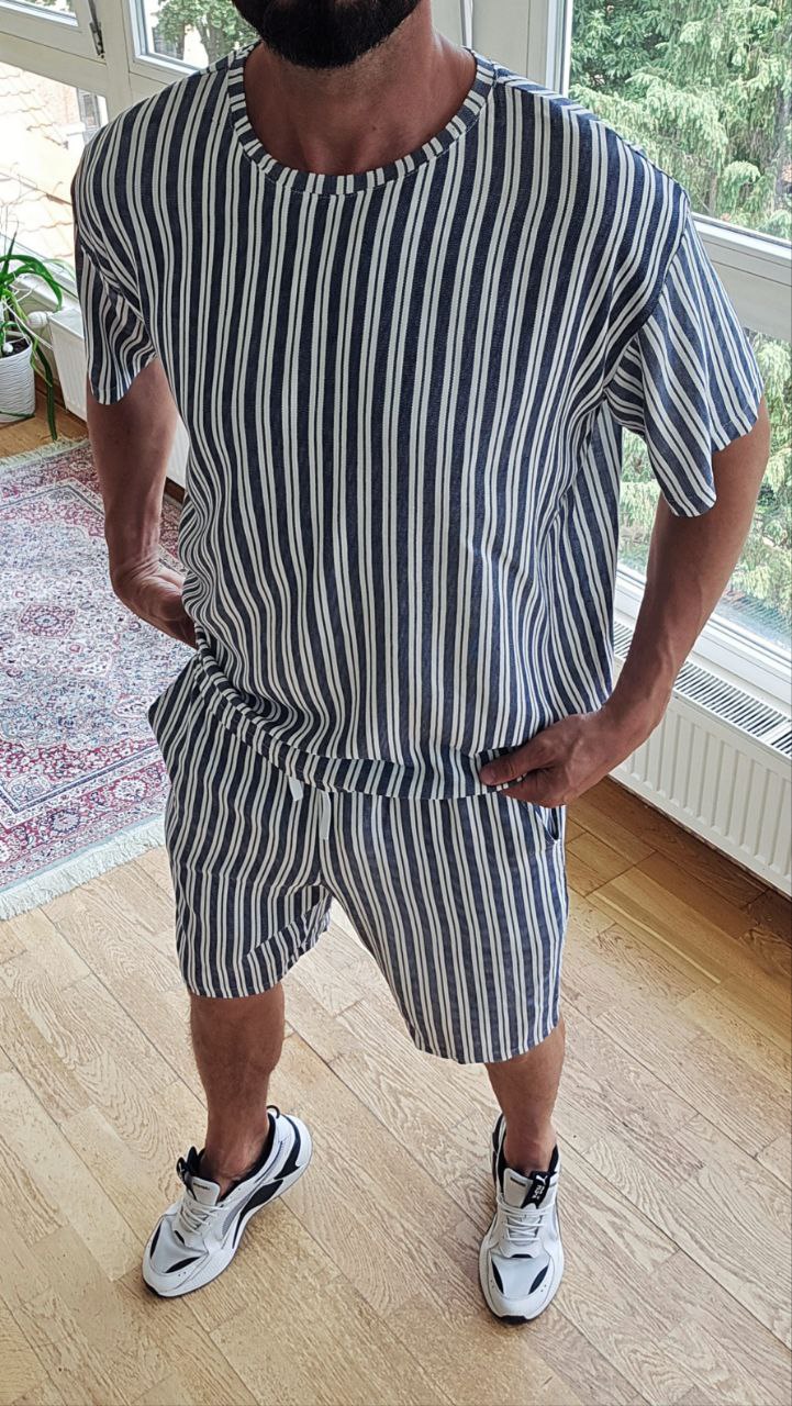 Футболка вільного крою з округлим вирізом + шорти на резинці зі шнурком і боковими кишенями.