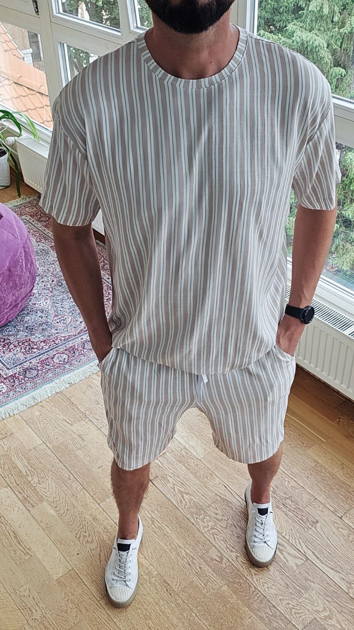 Футболка вільного крою з округлим вирізом + шорти на резинці зі шнурком і боковими кишенями.